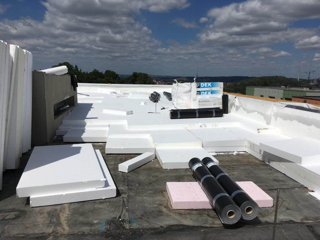 Hlavní hydroizolační vrstva byla provedena z kotvené TPO fólie MAPEPLAN TM (foto 11,12). Byla použita fólie tloušťky 1,5 mm svařovaná horkým vzduchem v přesazích. Kotevní prvek je umístěn ve spoji folií. U TPO fólie není nutné provádět separační vrstvu z textilie od EPS, což si izolatéři pochvalovali. Fólie byla vytažena až na korunu atiky. Tvar hydroizolace v přechodech mezi plochami střechy a atik zajistily lišty z poplastovaného plechu. Na střeše byl proveden také záchytný systém proti pádu osob.