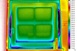 Pro porovnání je na obr. 6 uveden příklad termovizních snímků okna jiného objektu za přirozeného tlaku a za podtlaku bez zásadních netěsností (anomálií) funkční spáry. Téměř u všech výplní otvorů na posuzovaném objektu byly diagnostikovány netěsné funkční spáry, přičemž netěsnosti měly lokální charakter. Tvar a poloha teplotních polí ukazovaly na vyboulené rámy křídel, křídla v rámu vzpříčená nebo vadné těsnění. Některé ze zjištěných nedostatků se obvykle vyskytují při špatně seřízeném kování a lze je dodatečně odstranit. Některé nedostatky lze odstranit výměnou těsnění.