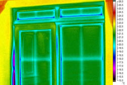 Bylo proto uskutečněno druhé místní šetření, při kterém jsme provedli termovizní měření oken nejprve při přirozeném tlaku a následně při podtlaku v interiéru, který byl vytvořen zařízením blower-door test. Ze získaných snímků bylo patrné, u kterých oken a v jakých místech se nachází výrazné netěsnosti ve funkční spáře, které způsobují značnou infiltraci a tím i značné snížení povrchových teplot na vnitřní straně okna. Na obr. 4 a 5 jsou uvedeny příklady termovizních snímků z hlediska průvzdušnosti vadného okna a vadných balkónových dveří.