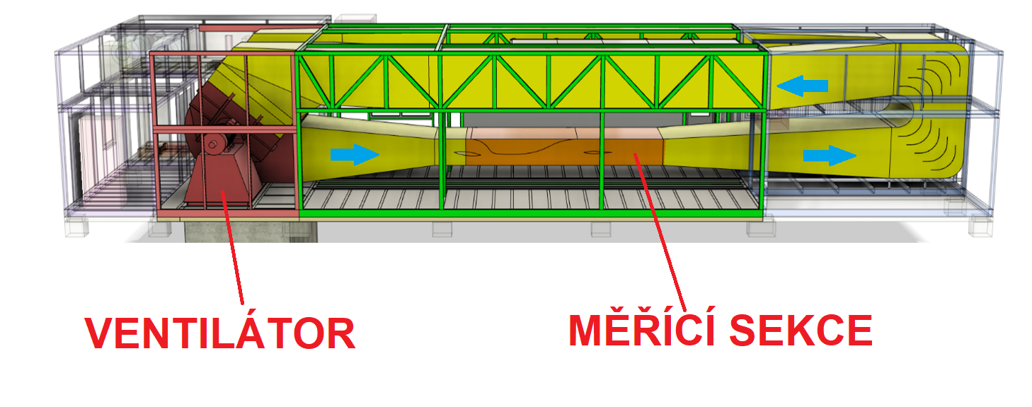 Zdrojem proudění vzduchu je cca 4 m vysoký radiální ventilátor o příkonu 250 kW (obr.6). Z radiálního ventilátoru vzduch proudí do měřicí sekce, kde je umístěn model testované konstrukce. Součástí měřicí sekce je i simulátor deště, který umožňuje zkrápět vzorek deštěm o řízené intenzitě.