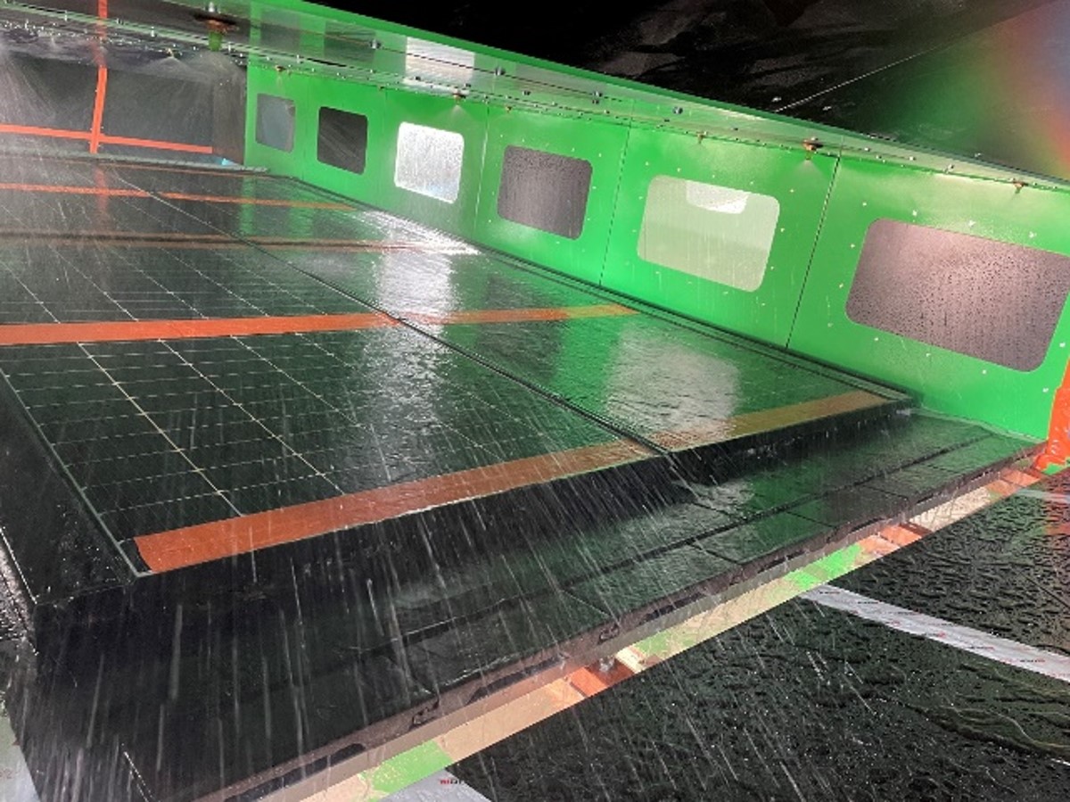 Toto nastavení zkoušky slouží především k hodnocení hydroizolační spolehlivosti konstrukcí šikmých střech se skládanou střešní krytinou, případně. větraných fasád. Prvním příkladem využití bylo ověření těsnosti systému DEKSOLAR INTEGRA (obr. 14).