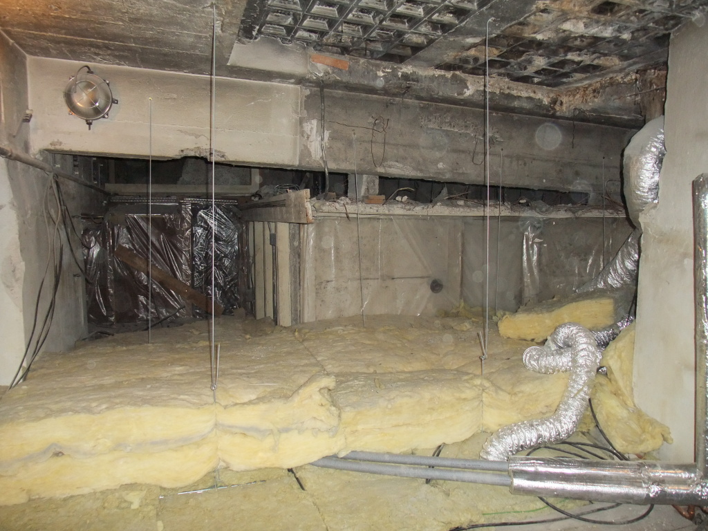 V minulosti bylo pod některými terasami provedeno provizorní zateplení z interiéru s využitím lehkého zavěšeného podhledu. Takové systémy vnitřního zateplení, které obsahují parozábranu z fólie lehkého typu nelze v daném případě (obytné místnosti) doporučit. Riziko netěsnosti tenké fóliové parozábrany je obrovské (nejen v ploše, ale zejména v detailech napojení na prostupující a navazující konstrukce) a vedlo by ke kondenzaci vodní páry nad podhledem v chladných obdobích roku.