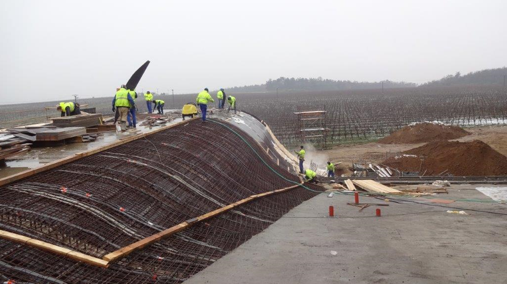 O9: V betonárně byla speciálně upravována konzistence betonové směsi a betonáž desky ve sklonu probíhala po etapách. Beton byl vypouštěn z bádie manipulované jeřábem.