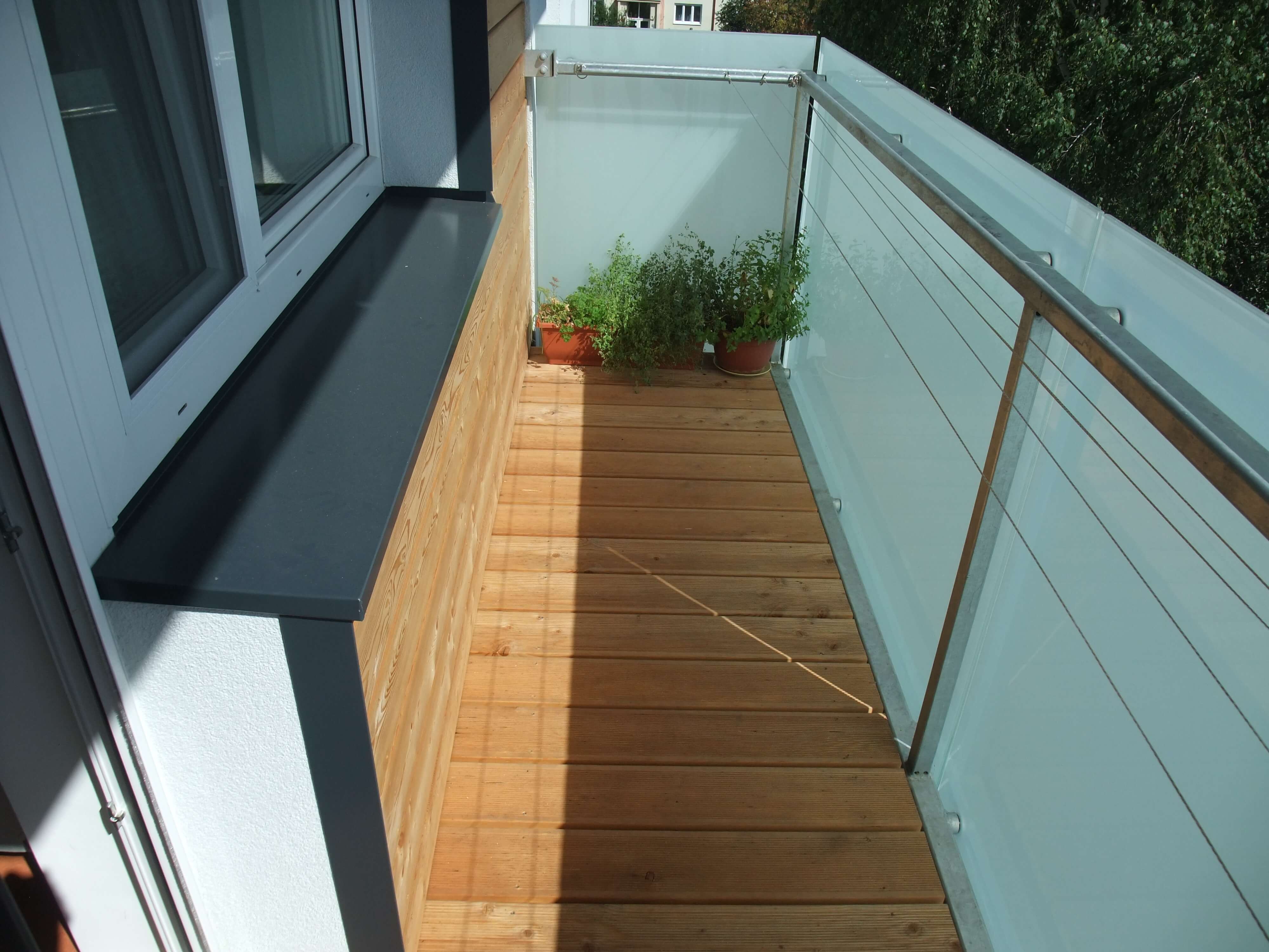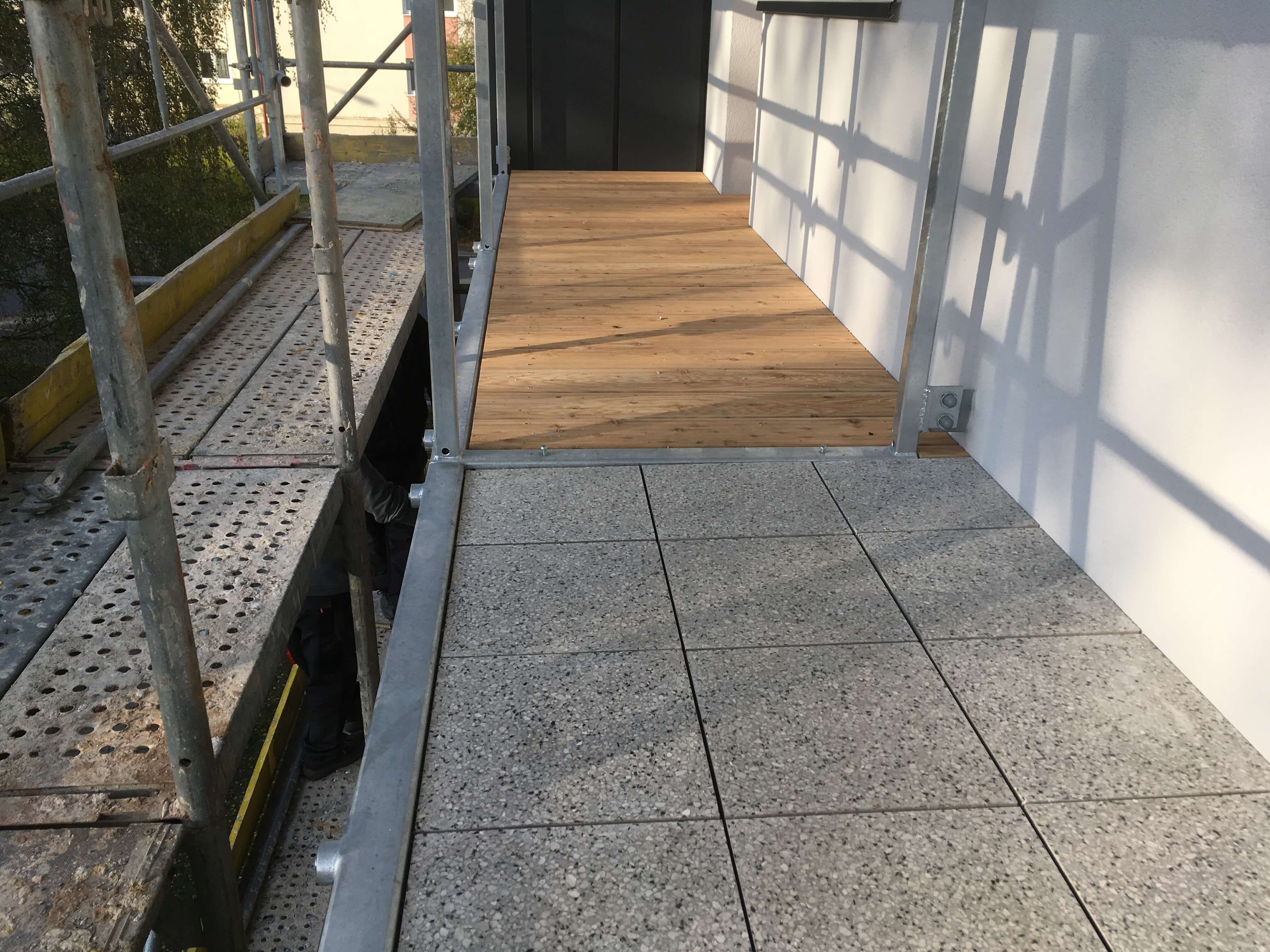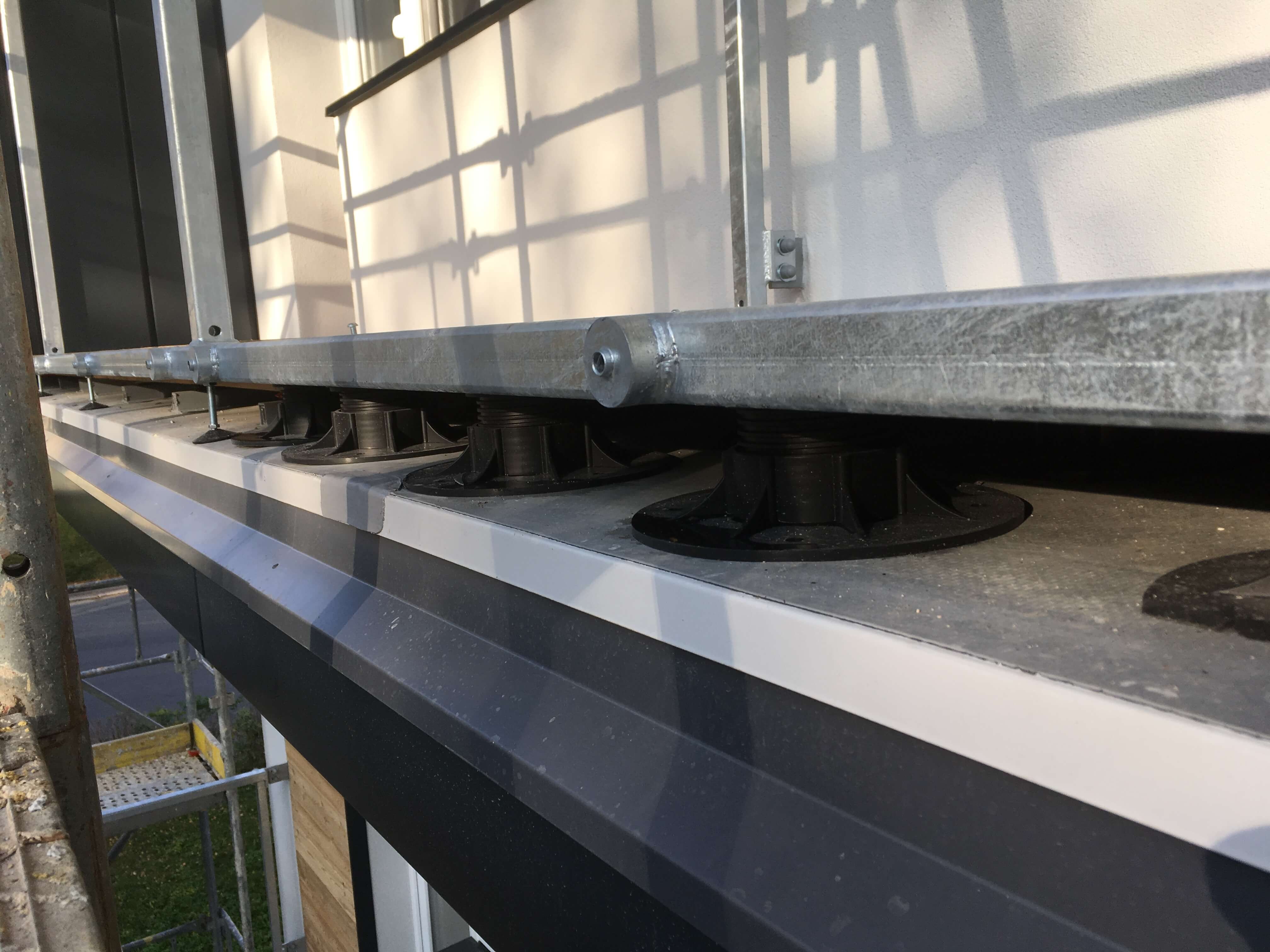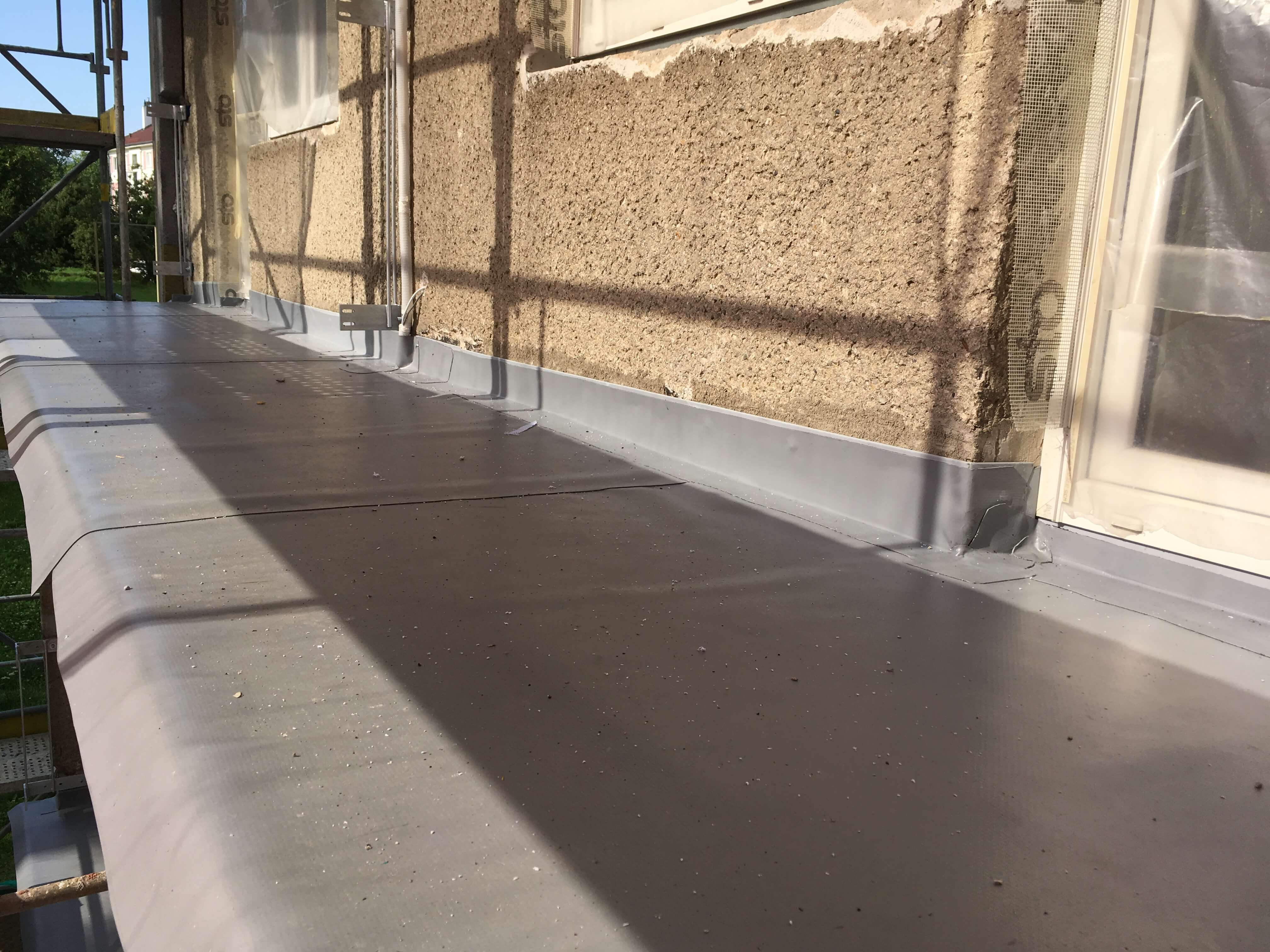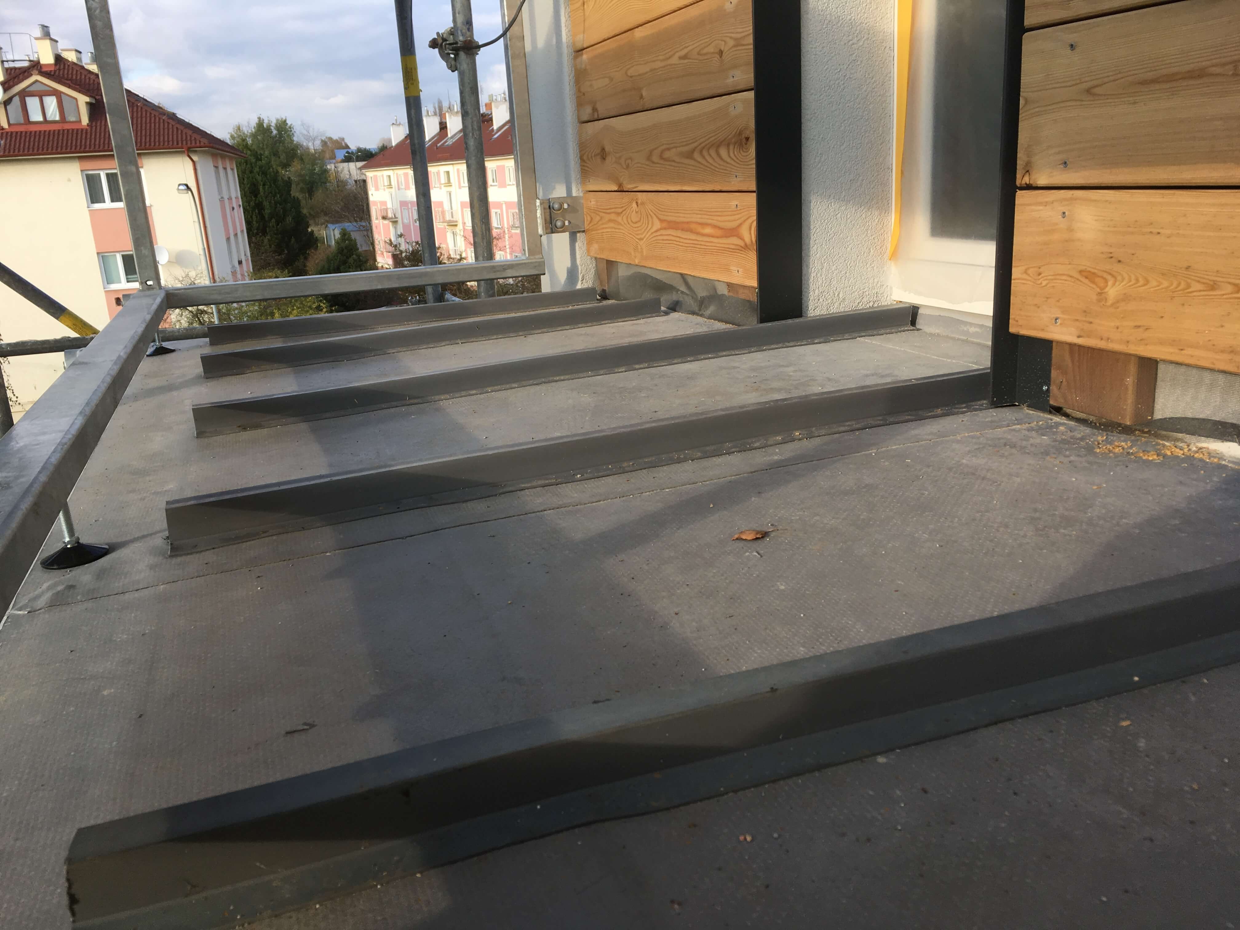 Nové řešení skladby spočívalo v provedení povlakové hydroizolace z PVC-P tl. 1,8 mm na dostatečně spádovaný podklad (2%) tvořený tepelnou izolací z XPS. Tuhá tepelněizolační vrstva byla zvolena z důvodu lokálně podepírané pochůzné vrstvy (dlažba na podložkách či dřevěný rošt, dle preference uživatele), kvůli stabilitě byla nalepena k podkladu. Pochůznou vrstvu se spárami propouštějícími vodu k hydroizolaci pak bylo možné klást vodorovně, což zpříjemnilo užívání balkónů. Konzoly balkónů byly pochopitelně zatepleny i ze strany podhledu, aby byl omezen tepelný most touto konstrukcí.