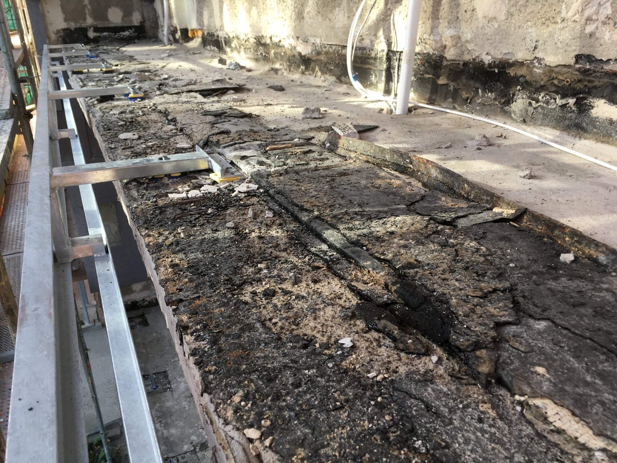 Nejprve bylo třeba odstranit původní zkorodované ocelové konstrukce zábradlí a dělicí příčky s výplní z drátoskla. Původní skladba podlah tvořená teracovou dlažbou kladenou do spádované betonové mazaniny byla vybourána (zejména u okrajů šla vzhledem k vyluhování pojiva z betonu rozebírat ručně). Tak byla obnažena slabina původního řešení – hydroizolace z oxidovaných asfaltových pásů kladená na železobetonovou konzolu balkónů bez spádu a bez drenážní vrstvy, pod betonovou mazaninou těžko přístupná pro opravy. Tyto asfaltové pásy byly kladeny jen ve vodorovné ploše, u okapu a u stěny byly napojeny na klempířské konstrukce. Vzájemné napojení již dávno nebylo vodotěsné, docházelo k zatékání do nosné konstrukce. Sloupky zábradlí prostupující hydroizolací byly zkorodované. Nesoudržné části obnažené železobetonové konstrukce byly odstraněny, provedla se pasivace obnažené výztuže a hrubá reprofilace tvaru.