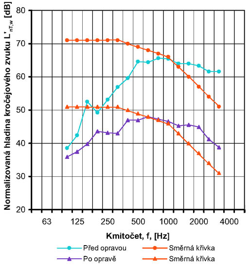 Oprava tedy spočívala v odsekání podlahového souvrství od stěny podél stěny bytu a vložení pružného pásku do spáry. Po opravě bylo provedeno opakované měření kročejové neprůzvučnosti pro ověření účinnosti (v grafu na obr. 01 křivka „po opravě“). Měřením byla zjištěna kročejová neprůzvučnost mezi uvedenými místnosti L´nT,w = 60 dB. Provedenou opravou bylo dosaženo zlepšení o 14 dB ve vážené hodnotě neprůzvučnosti. Z grafu je zřejmé, že opravou uvedené vady bylo dosaženo zvýšení kročejové neprůzvučnosti ve všech hodnocených kmitočtových pásmech. Většího zlepšení bylo dosaženo na středních a vyšších kmitočtech. Z grafů je rovněž patrné, že o vážené hodnotě kročejové neprůzvučnosti rozhodují právě hodnoty ve vyšších kmitočtových pásmech (rozhodující jsou kladné rozdíly mezi naměřenými hodnotami a hodnotami na směrné křivce), proto je důležité dosažení zvýšení neprůzvučnosti především na těchto kmitočtech. Průběh hladiny akustického tlaku kročejového zvuku s dominantními vyššími kmitočty obvykle ukazuje na pevné propojení s navazující konstrukcí a přenos hluku tímto propojením. Navíc i po opravě je naměřená hodnota mírně vyšší než hodnota požadovaná. Odsekání podlahového souvrství nebylo provedeno po celém obvodu podlahy. V některých složitých detailech ve styku s nosnou železobetonovou konstrukcí objektu bylo ponecháno pevné spojení (schodišťová ramena, výtahová šachta), kterým pravděpodobně stále dochází k přenosu kročejového hluku do nosné konstrukce objektu.