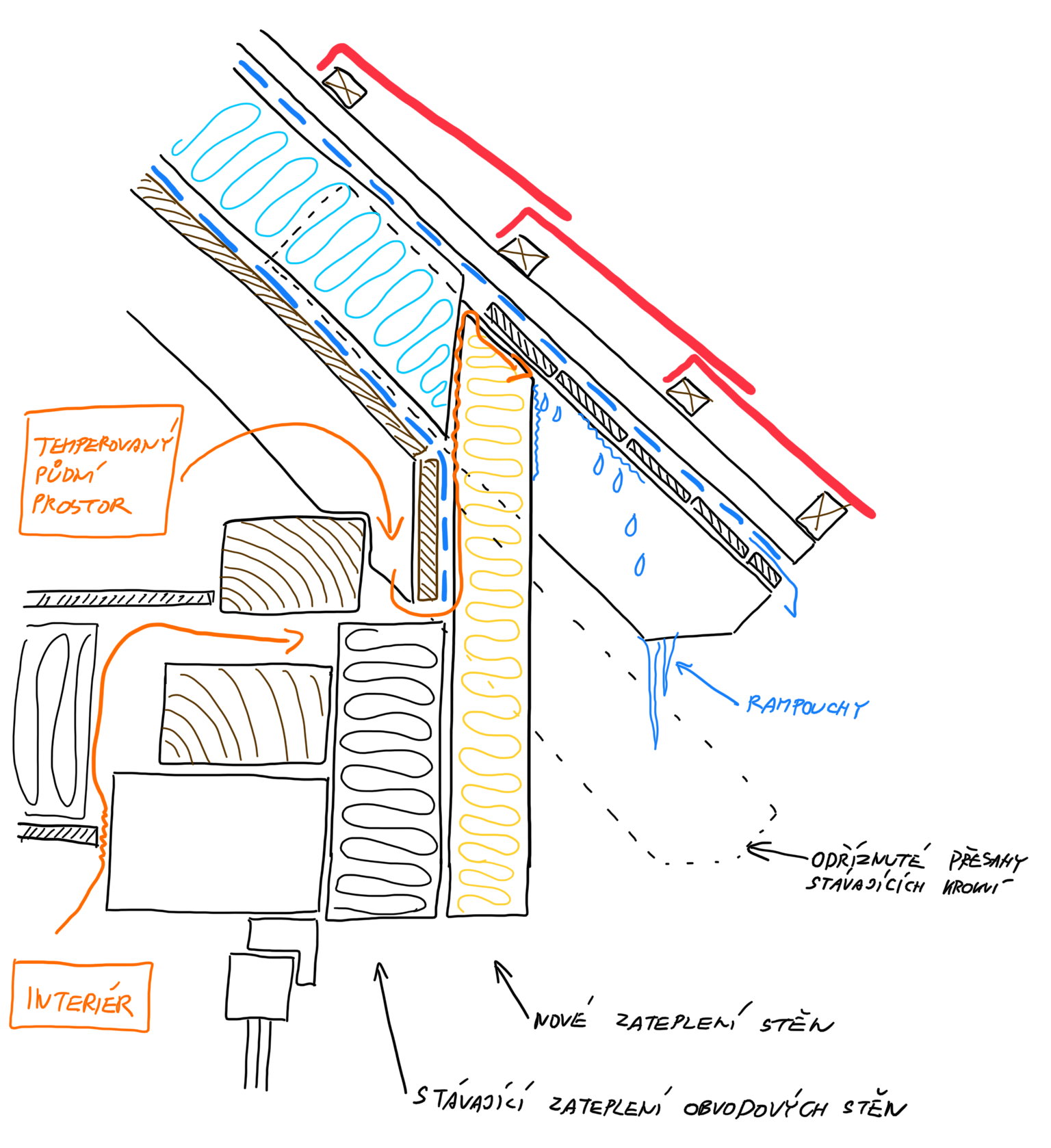 V našem případě byly přesahy krokví odřezány a přesah střechy byl vytvořen dřevěnými hranolky připevněnými přes parozábranu a bednění do krokví. Zateplení střechy a fasády bylo provedeno na podzim a hned v únoru volal investor, že má problém se střechou v jejím přesahu přes obvod stavby. Vznikala námraza na zateplení fasády a na podbití z palubek, tvořily se rampouchy na okapových podporách.