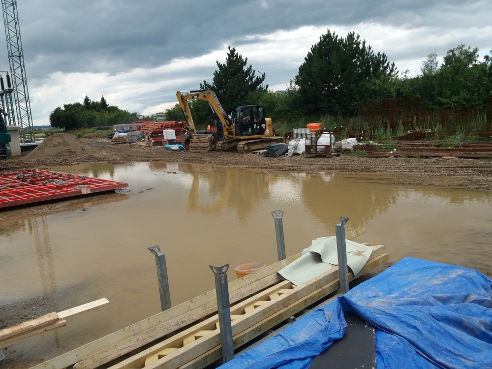 Největším nepřítelem se pro realizační firmu stalo deštivé počasí. Uplatnil se jeden z paragrafů Murphyho zákona pro stavebnictví: „Před jakoukoliv betonáží den až dva prší“. Což značně znepříjemňovalo situaci v areálu a na stavbě samotné (obr. 04 a 05).