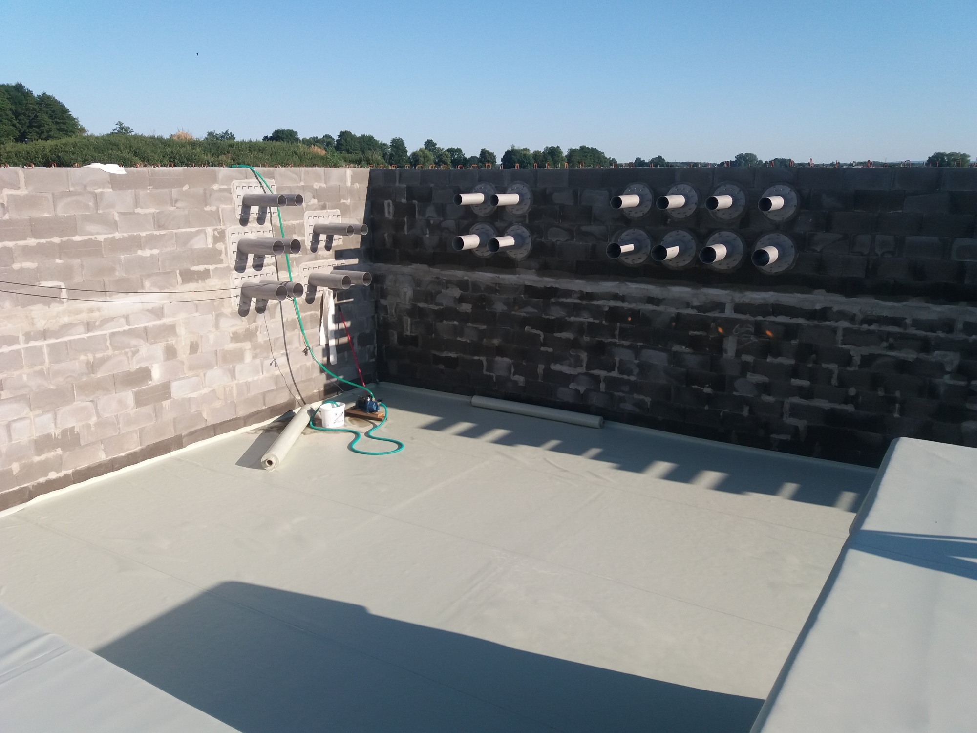 Následovaly práce na první vrstvě svislých izolací s poměrně složitějším vyměřením a opracováním vodorovných prostupů (obr.07). Prostupy byly připraveny osazením nerezových přírub při výstavbě ŽB stěny ze ztraceného bednění. Práce pokračovaly instalací injektážních trubic, druhé vrstvy PVC, svařením jednotlivých sektorů a přechodových trubic.