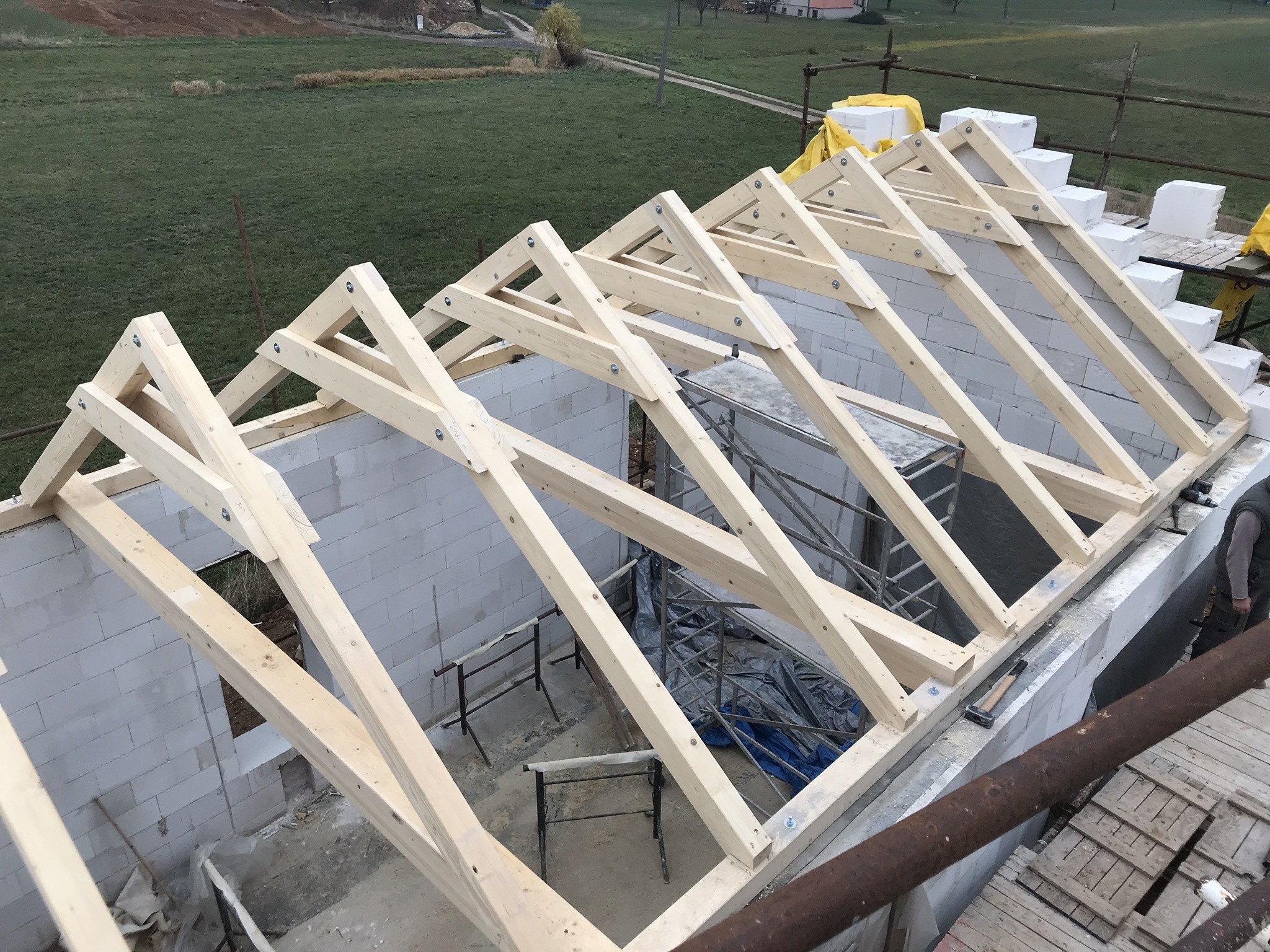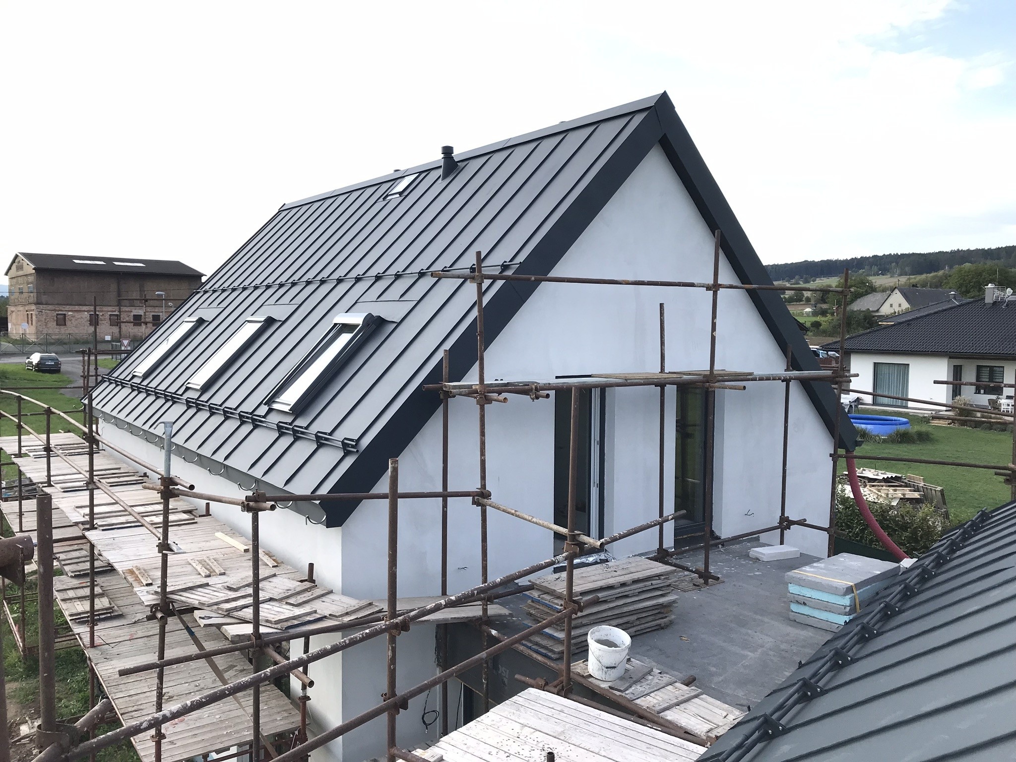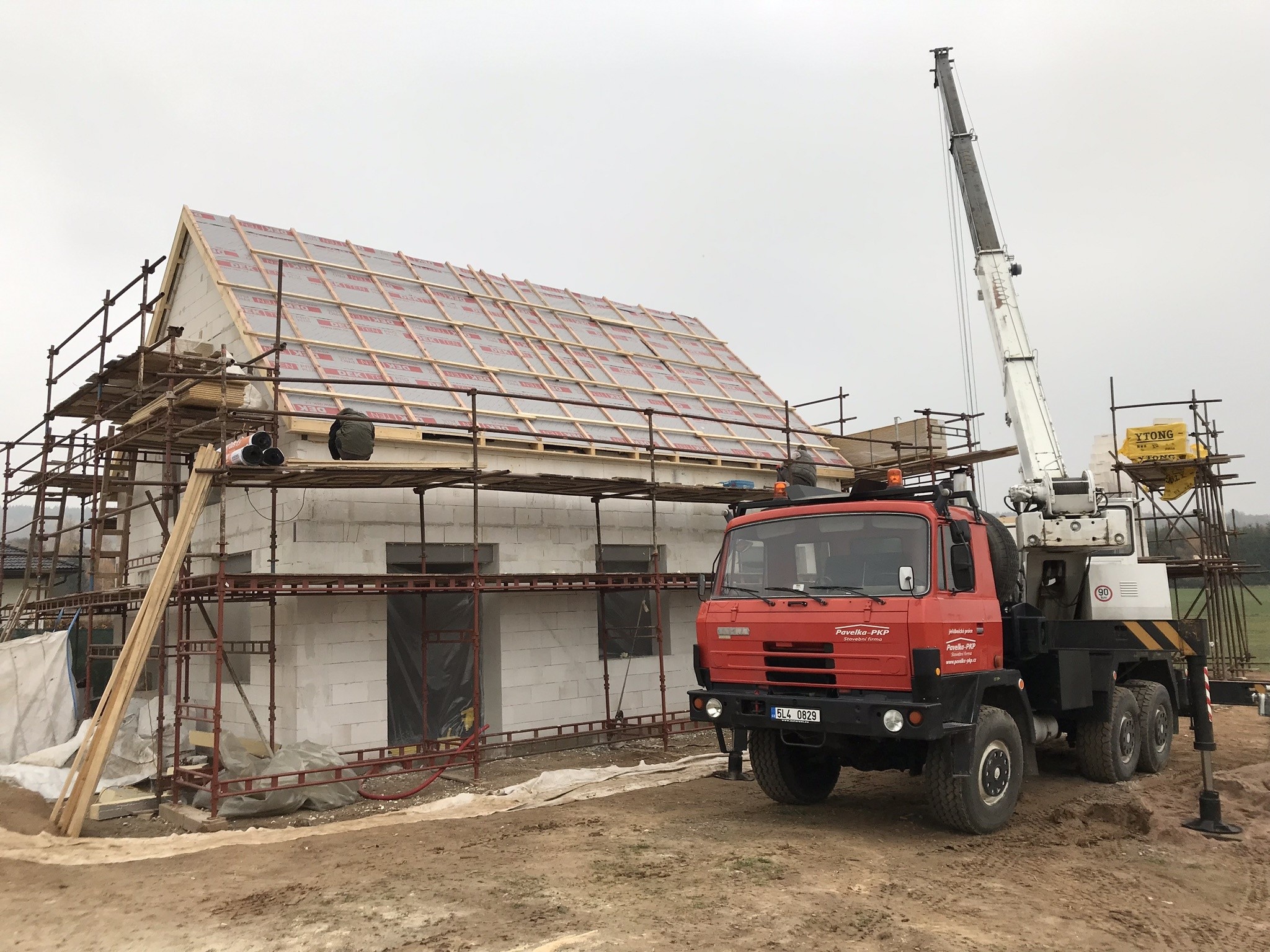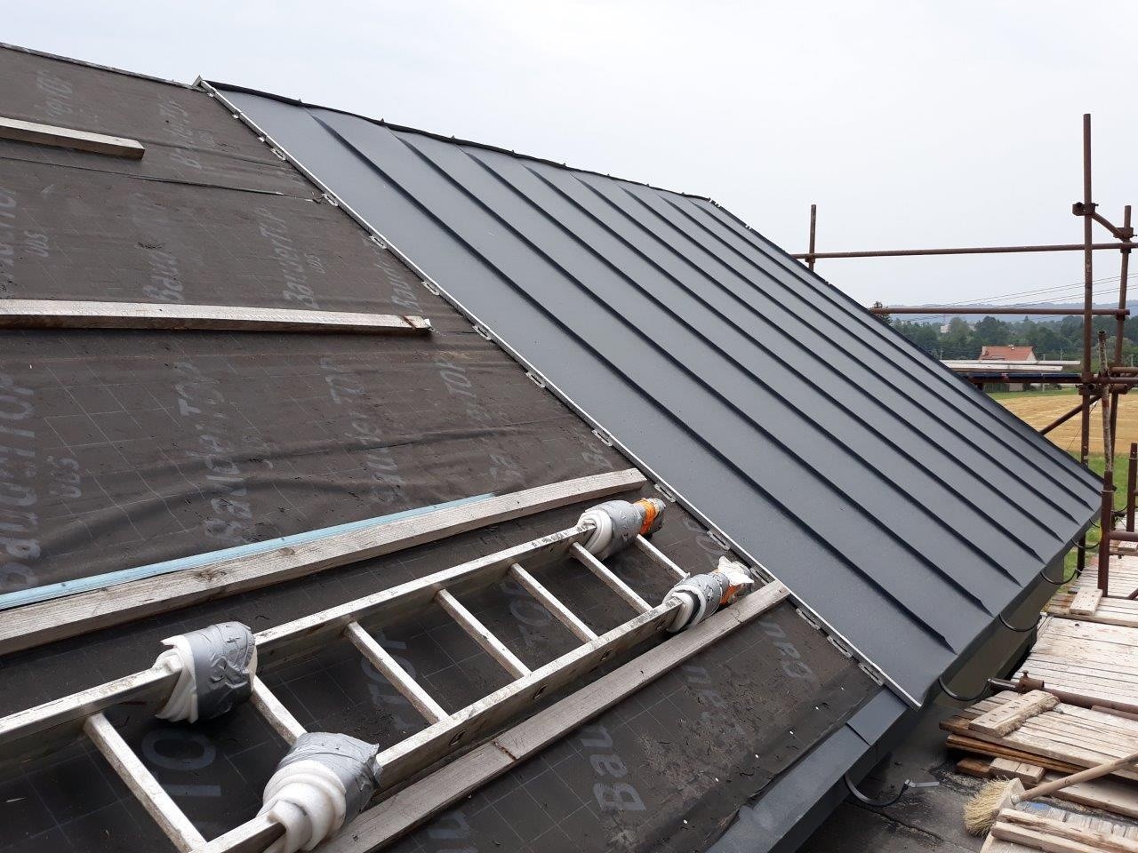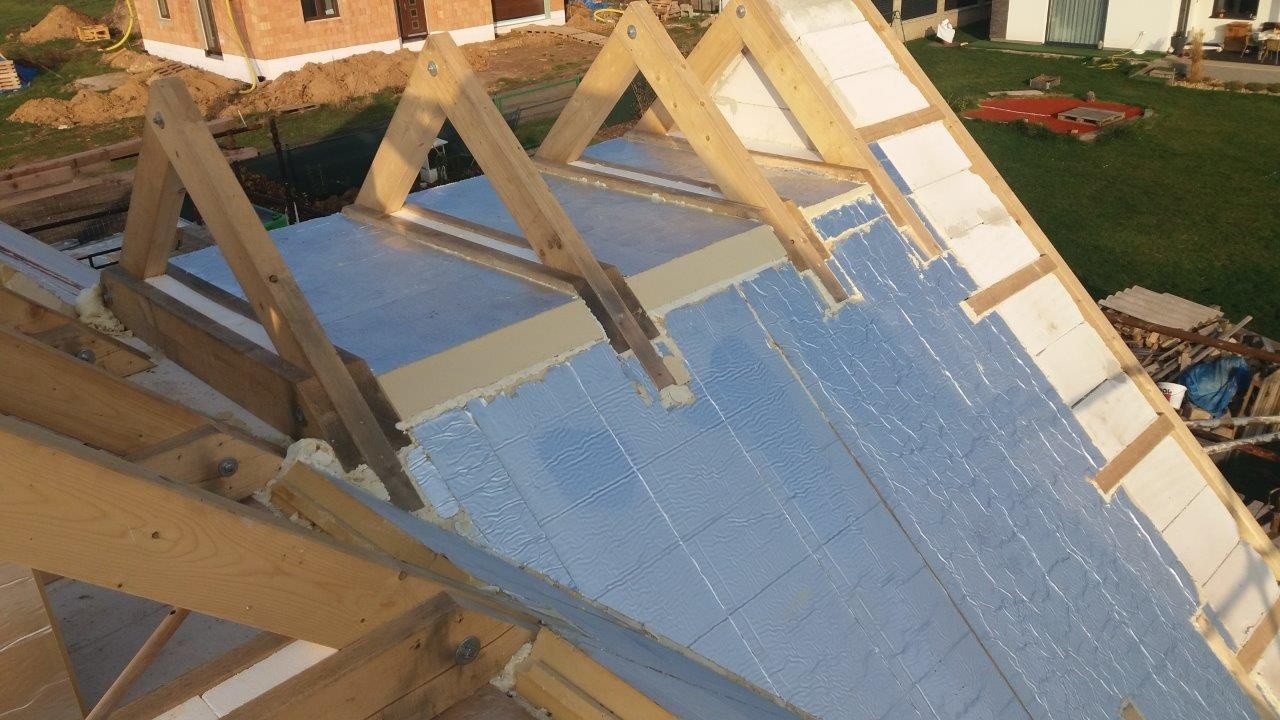 Tepelná izolace TOPDEK 022 PIR je kladena na masivní nosnou konstrukci s dokončenou parozábranou. Krov nad střešní dutinou ponese již jen DHV a krytinu. Ve střešní dutině pod vrcholovým krovem vznikl prostor pro skladování. Vstup do něj musí být zateplený a vzduchotěsný.