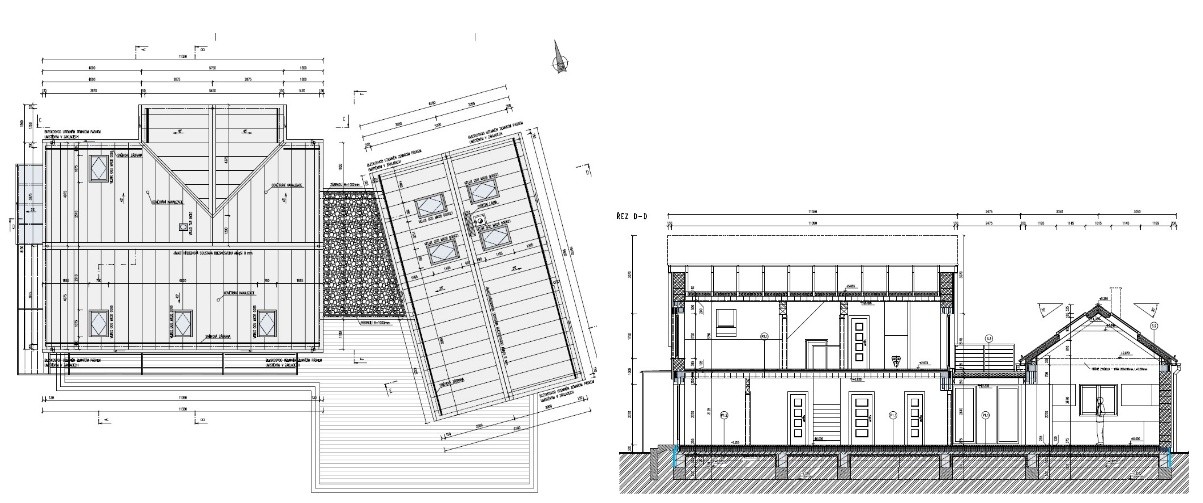 Střechy obou objektů jsou navrženy v nadkrokevním systému TOPDEK. U přízemního objektu byl jedním z požadavků projektanta pohledový dřevěný krov viditelný z interiéru až do hřebene. Tam byla realizována systémová skladba DEKROOF 11-D (ve Stavební knihovně DEK označena ST.8002B).