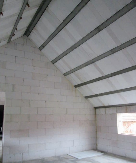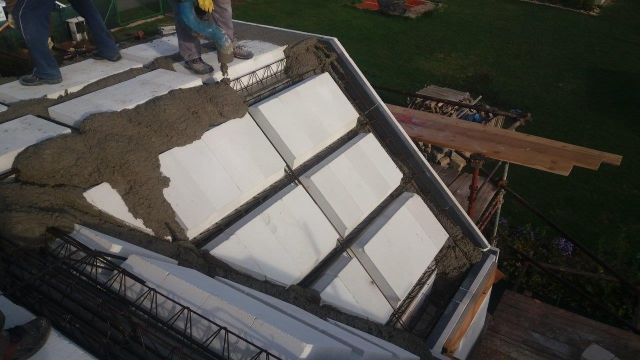 Vzhledem k tomu, že v podkroví dvoupodlažní části jsou umístěny ložnice a dětské pokoje, byl projektant rozhodnutý nejít v řešení nosné konstrukce střechy cestou tradičního dřevěného krovu a využil v našich končinách zatím méně obvyklou masivní nosnou konstrukci. Když to hodně zjednodušíme, jedná se o nakloněnou stropní konstrukci z železobetonových nosníků s vloženými pórobetonovými tvarovkami. Hlavním argumentem pro tento systém byla tepelná pohoda v podkroví během horkých letních měsíců. Byla realizována systémová skladba DEKROOF 20-A (ve Stavební knihovně DEK označena ST.8004E).