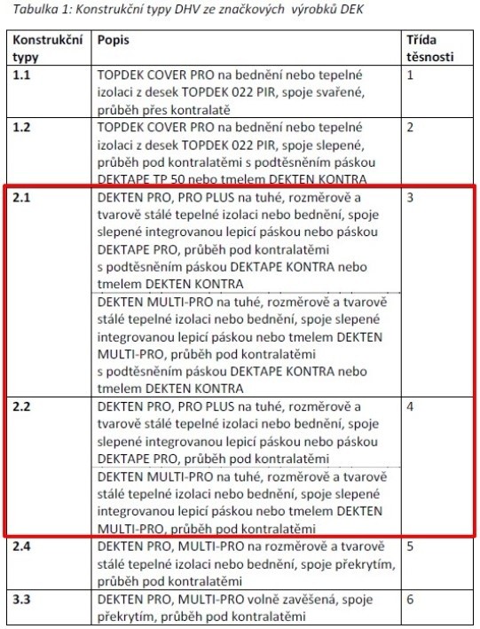 Tepelná izolace TOPDEK 022 vytváří na šikmině dostatečně tuhý podklad pro realizaci doplňkové hydroizolační vrstvy z difuzní folie DEKTEN PRO PLUS. Vznikne tak DHV konstrukčního typu 2.2, což odpovídá třídě těsnosti 4 dle publikace Pravidla pro navrhování a provádění střech, CKPT z roku 2014. Pokud by navíc kontralatě byly vůči DHV těsněné speciální páskou nebo tmelem, bylo by docíleno konstrukčního typu 2.1 a třídy těsnosti 3. Lze považovat za přijatelné, že nad střešní dutinou je DHV z fólie lehkého typu bez podkladu napnuta mezi krokvemi. Jedná se o malý rozsah ve vrcholové části střechy a případné drobné úkapy je povrch použitého materiálu tepelněizolační vrstvy schopen zadržet tak, aby se mohly odpařit do vnějšího prostředí, je-li správně zajištěno větrání střešní dutiny. Navíc při daném sklonu střechy bude plechová drážková krytina podložená asfaltovým pásem velmi těsná. Nutno ale dodat, že pás pod krytinou nelze dle Pravidel považovat za doplňkovou hydroizolační vrstvu. Není totiž umožněn hladký odtok vody po jeho povrchu ani odvod vlhkosti mezi ním a krytinou větráním.