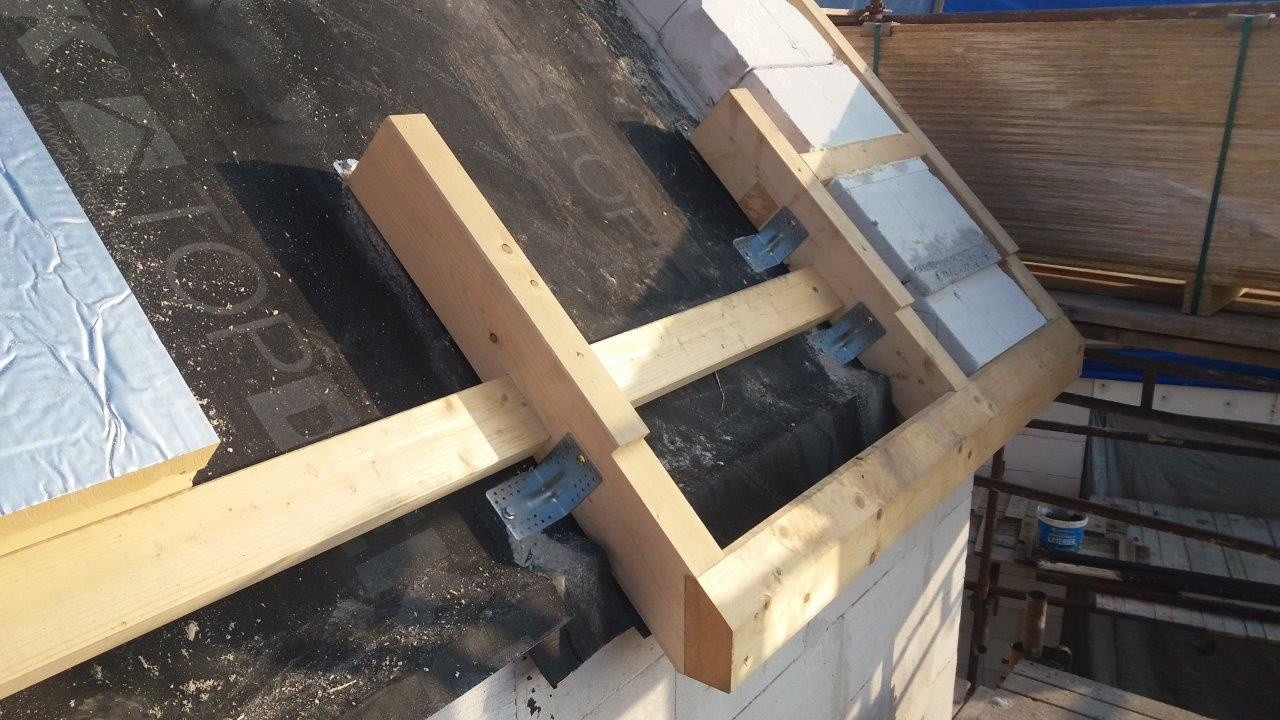 U okapové hrany byly osazeny dřevěné smykové podpory, které zároveň nesou minimální přesah střechy. Podpory jsou fixovány pozinkovanými úhelníky 90x105x105. Úhelníky jsou umístěny na obou stranách podpor. Do dřeva jsou kotveny vrutem RAPI-TEC SK PLUS a do betonu vrutem MMS plus 10x70 se šestihrannou hlavou a podložkou.