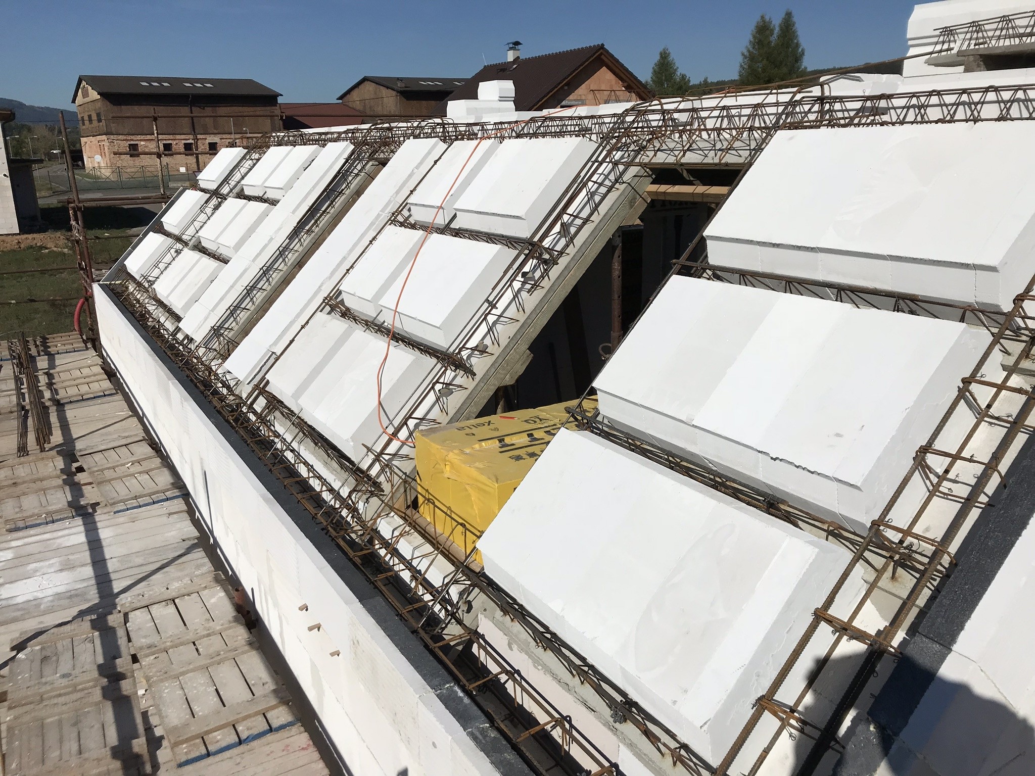 Na vyzrálou nosnou konstrukci se nanesl nátěr DEKPRIMER a provedla se parozábrana ze samolepicího SBS modifikovaného asfaltového pásu TOPDEK AL BARRIER.