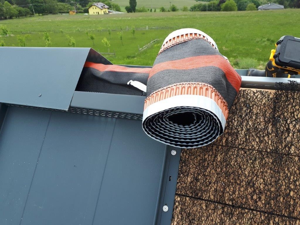 Současně s položením tepelné izolace z PIR desek se prováděla montáž doplňkové hydroizolační vrstvy z difuzní folie DEKTEN MULTI-PRO II a také kontralatí o výšce 60 mm. Tloušťka vzduchové mezery byla 60 mm s ohledem na plechovou krytinu. Kontralatě, a tím i skladba střechy, se přikotvily vruty TOPDEK ASSY do příčné „krokve“ (Foto 8). Kontralať byla dělena na délky 1,35 m dle šířky difuzní folie, na každý úsek dle výpočtu připadly 2 kolmé a jeden šikmý vrut. Pro zvýšení těsnosti systému byly použity těsnící pásky pod kontralať DEKTAPE KONTRA.