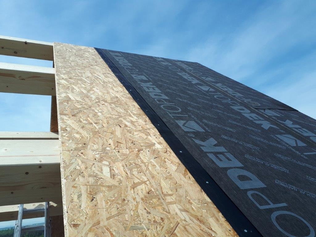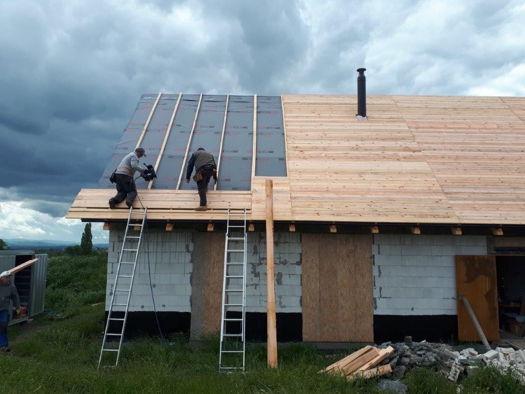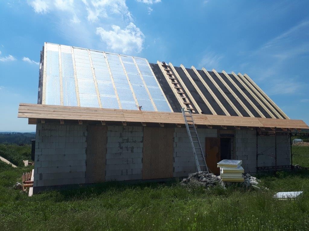 Záklop střechy byl proveden z OSB 3 desek P+D v tl. 22 mm (Foto 3 a 4), montoval se odshora, kvůli velké rozteči krokví. Parotěsnicí vrstva byla provedena ze samolepicího pásu s AL vložkou TOPDEK AL BARRIER. S ohledem na sklon střechy byly pásy pokládány shora dolů. Podélné spoje jsou samolepicí a střecha tak byla ihned zabezpečena proti provětrnostním vlivům. Parozábrana je u okapu napojena na žb. věnec.