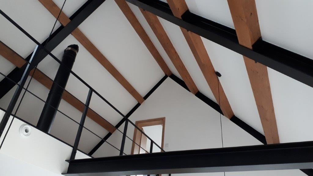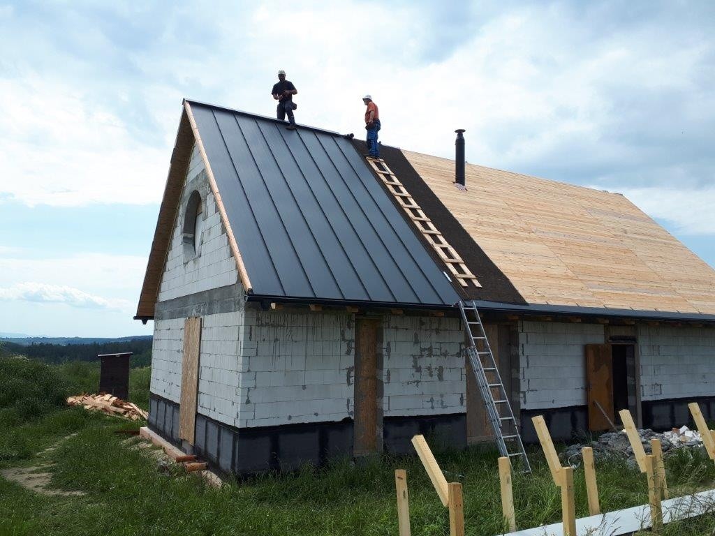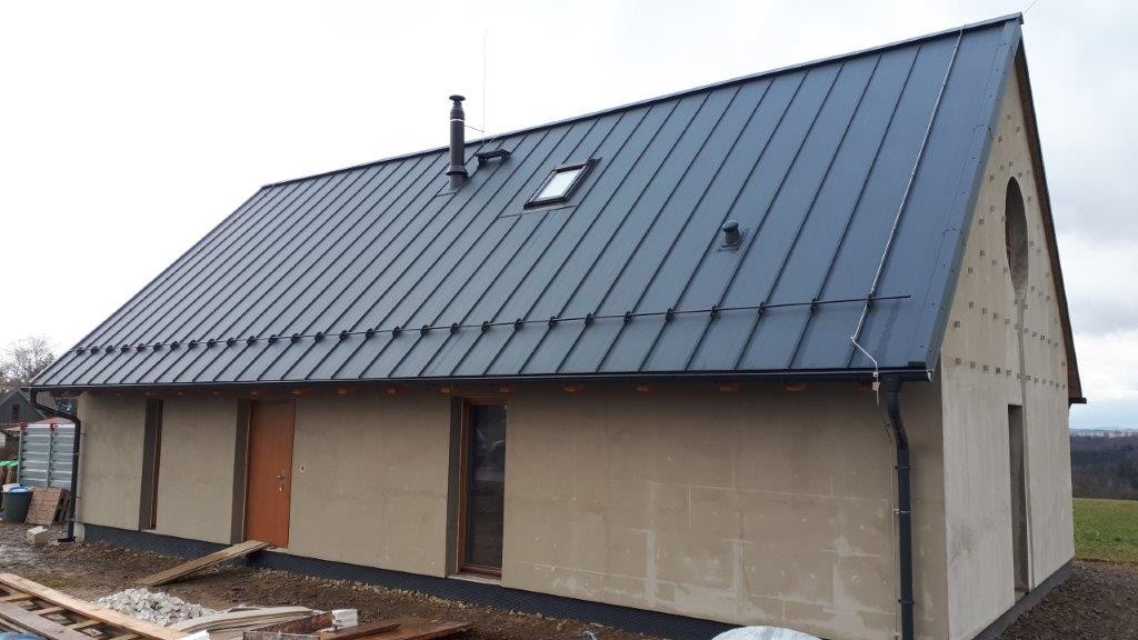 Následně bylo provedeno celoplošné bednění z prken (Foto 9). Krytina byla vybrána hladká plechová a byla položena na smyčkovou rohož, která tvoří separační vrstvu (Foto 10 a 11). Krytina byla provedena v souladu s podklady výrobce, včetně větrání hřebene a sněhových zachytávačů (Foto 12 a 13). K záklopu z OSB desek se připevnily sádrokartonové desky vložené mezi krokve „po vlašsku“ (Foto 14). Výsledný podhled se dle informací od investora velmi povedl a splnil jeho očekávání.