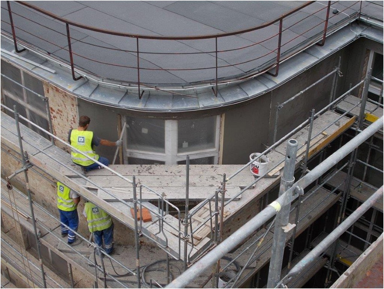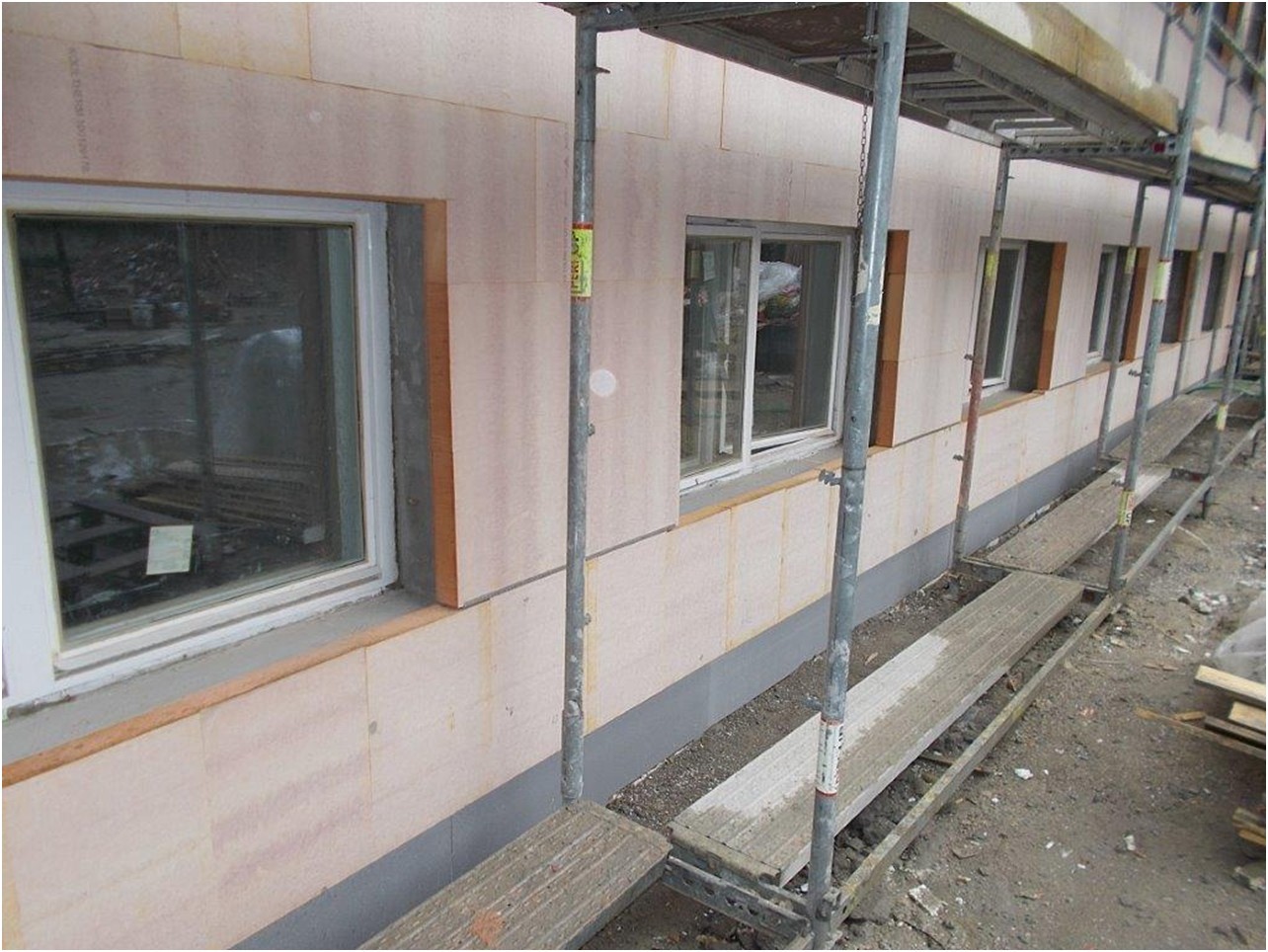 V prvním kroku došlo k plošnému oklepání staré břizolitové omítky. Obvodové cihelné zdivo bylo následně zbaveno nečistot, mastnoty a všech volně se oddělujících vrstev, případně materiálů, které se rozpouští ve vodě (obr. 3, 4). Jelikož povrch izolačních desek Kingspan KOOLTHERM K5 nelze dodatečně upravovat broušením, bylo nutné věnovat zvýšenou pozornost rovinnosti podkladu. Nerovnosti větší než 10 mm/m bylo doporučeno vyrovnat cementovou maltou. Z důvodu zvýšení přídržnosti a snížení savosti podkladu byl podklad ošetřen penetrací.