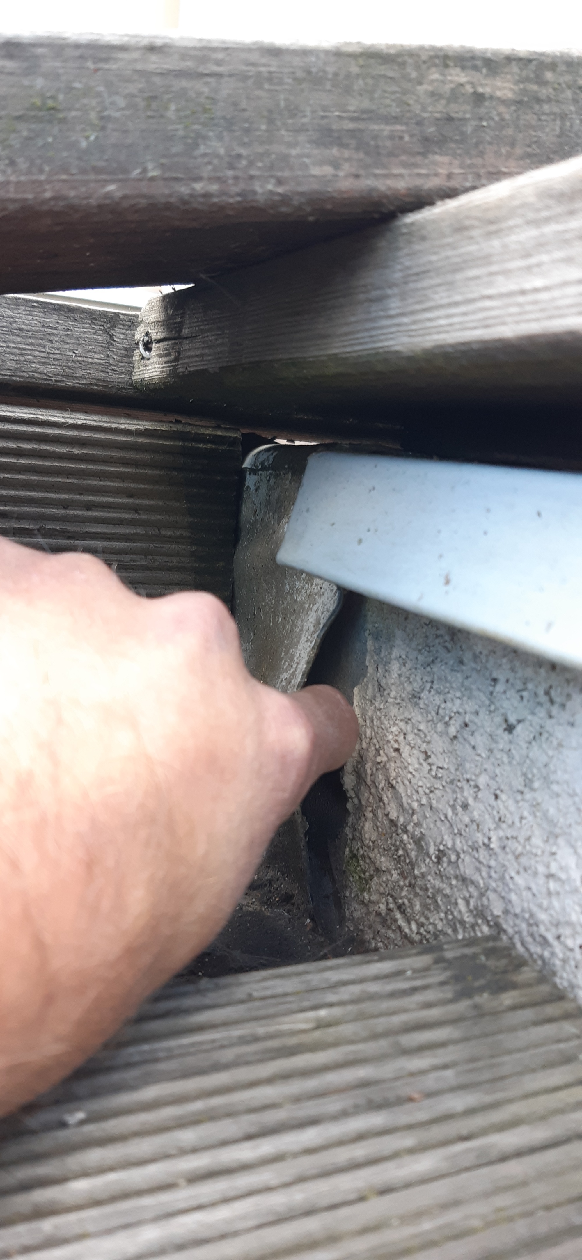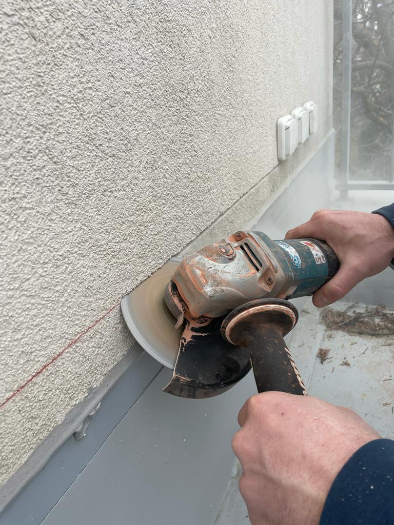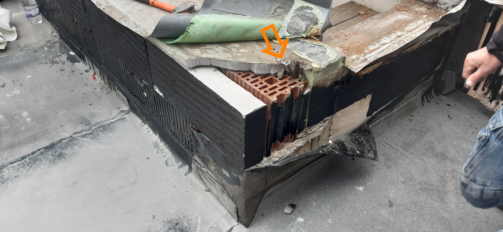Na střeše ložnice vznikla pobytová terasa se schodištěm navazujícím na zahradu za domem. Terasa se po těch deseti letech dostala do havarijního stavu a do prostor pod ní zatékalo. Již při první prohlídce byly zjištěny nesprávně řešené detaily napojení hydroizolační fólie na navazující stěny a na atiku. Bylo velmi pravděpodobné, že jsou příčinou zatékání do interiéru. Dalším problematickým místem bylo kotvení zábradlí do koruny atiky. Podívejme se na fotografie z průzkumu a z následující demontáže terasy.
