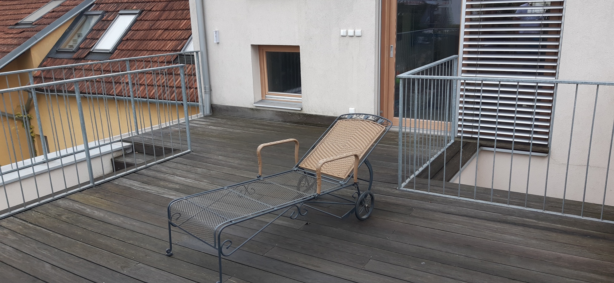 Investor požadoval vrátit stávající pozinkované zábradlí a osadit je do stejné výšky, v jaké bylo osazeno před rekonstrukcí. Tato výšková návaznost byla po celou dobu rekonstrukce jedním ze sledovaných parametrů rekonstrukce. Konstrukce zábradlí totiž výškově navazovala na konstrukci zděné plné atiky, respektive zábradlí k sousedovi (pro neprůhledné oddělení v řadové zástavbě). Změny v těchto výškových návaznostech stávajícího zábradlí, které mělo také zůstat bez úprav, by znamenaly zásahy do navazující fasády domu v 1NP. Tato souvislost je viditelná na obr. 26. Nově provedený detail atiky včetně vodorovného zateplení a vodovzdorné překližky pro kotvení zábradlí je na obrázku 19.