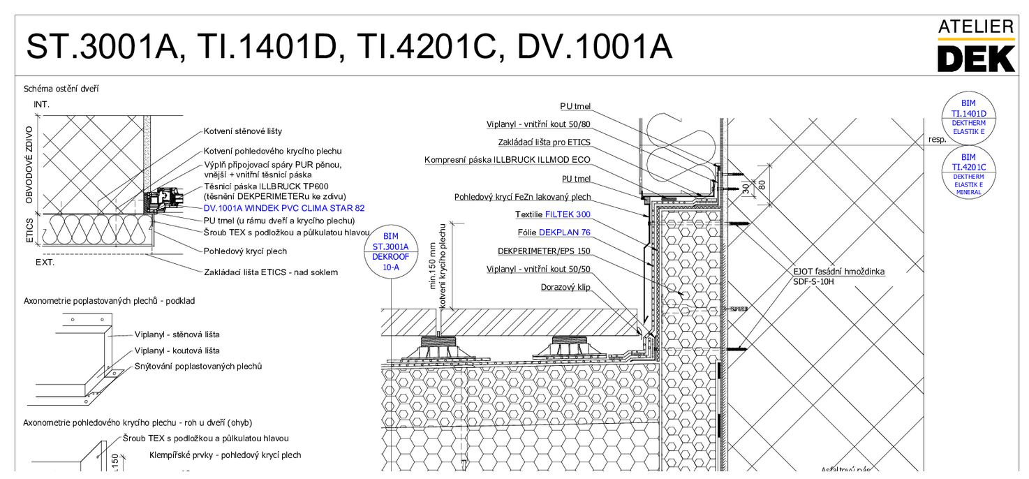 Po ověření proveditelnosti byl detail ukončení hydroizolační fólie z mPVC nebo TPO fólie) zařazen do knihovny detailů na webu dekpartner.cz. Ve Stavební knihovně DEK je přiřazen k systémovým skladbám terasy. Jde o skladby DEKROOF 10 – A (ST.3001A), DEKROOF 10 – D (ST.3001B). Řešení se zaříznutím do stávajícího ETICS doporučujeme ale realizovat především u rekonstrukcí. Pro novostavby preferujeme řešení s uskočením soklové oblasti pod zakládací lištu ETICS, viz Obr. 33.