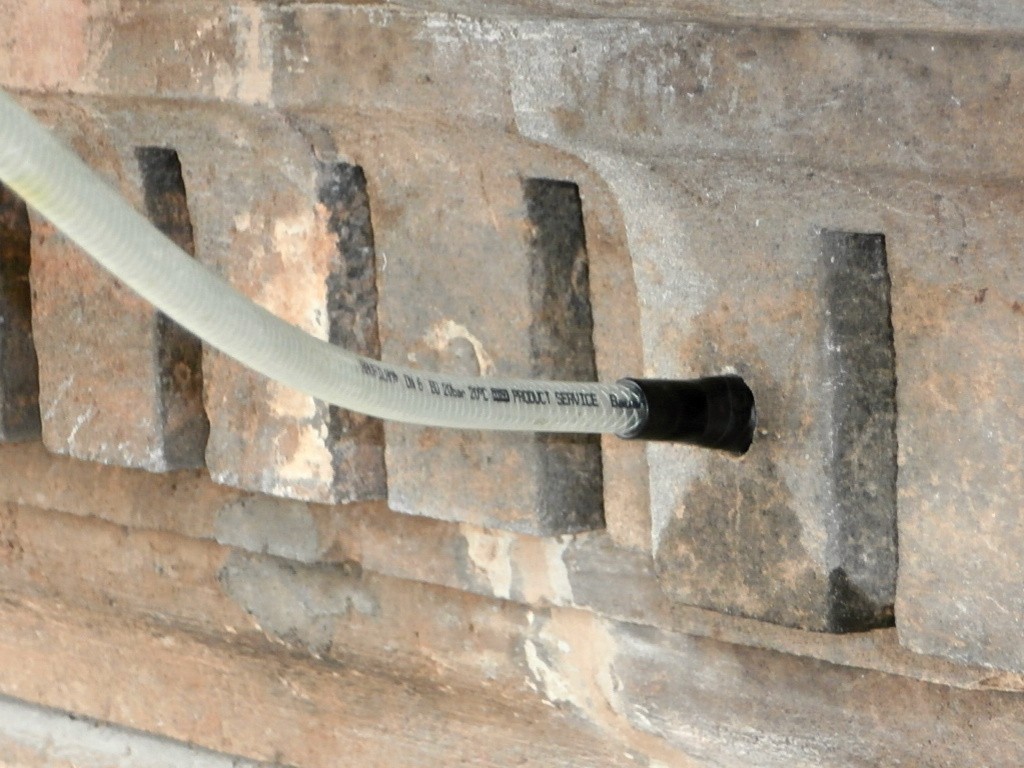 Sklolaminátové kotvy se zvolily pro svoji tahovou pevnost srovnatelnou s ocelí a vysokou korozní odolnost. Kotvy se zalévaly polyuretanem, který se při správném namíchání dostane i do mikroskopických pórů nebo prasklin. Přesnost namíchání byla velmi důležitá i pro to, aby zálivka nevytékala z otvorů ven. Po zafixování kotev se provedlo zaplombování otvoru kamenem.