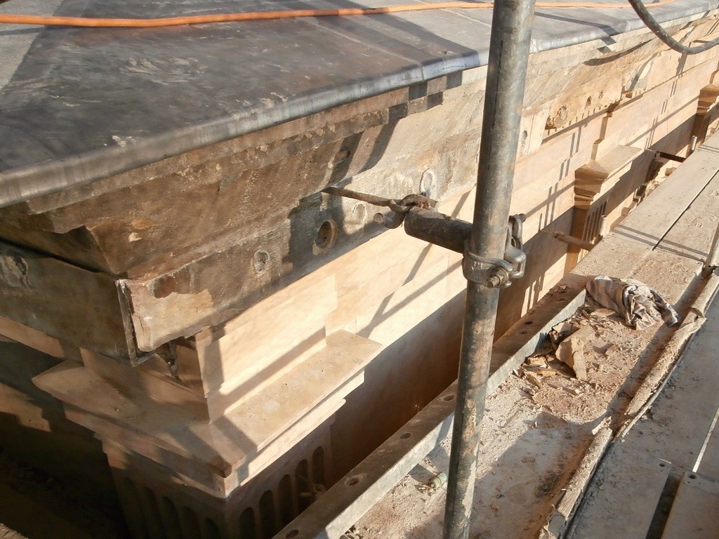 Oprava oblastí korunní římsy s železnými sponami, kde dosud nedošlo k separaci částí římsy