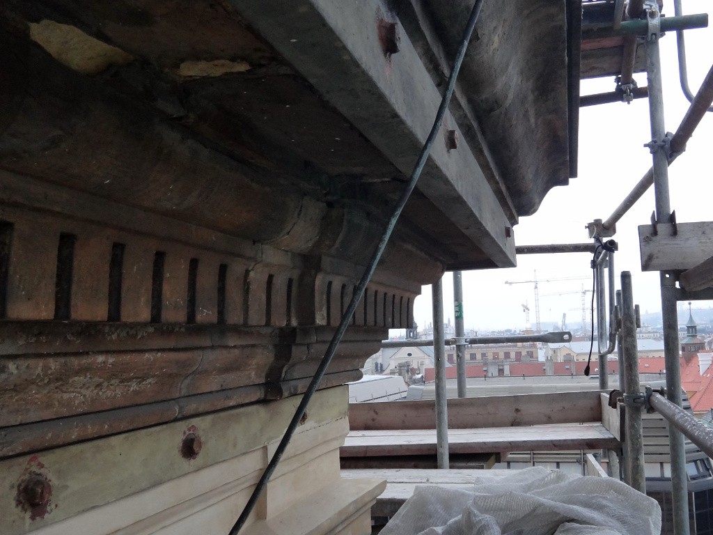 V současné době je korunní římsa zajištěna, je třeba si říci, že některé kotvy (kramle) v korunní římse byly ponechány, protože je ani detektor nenašel. Do míst, kde detektor žádné kramle nenašel, ale daly se tam předpokládat, byly injektovány inhibitory koroze (foto 15).