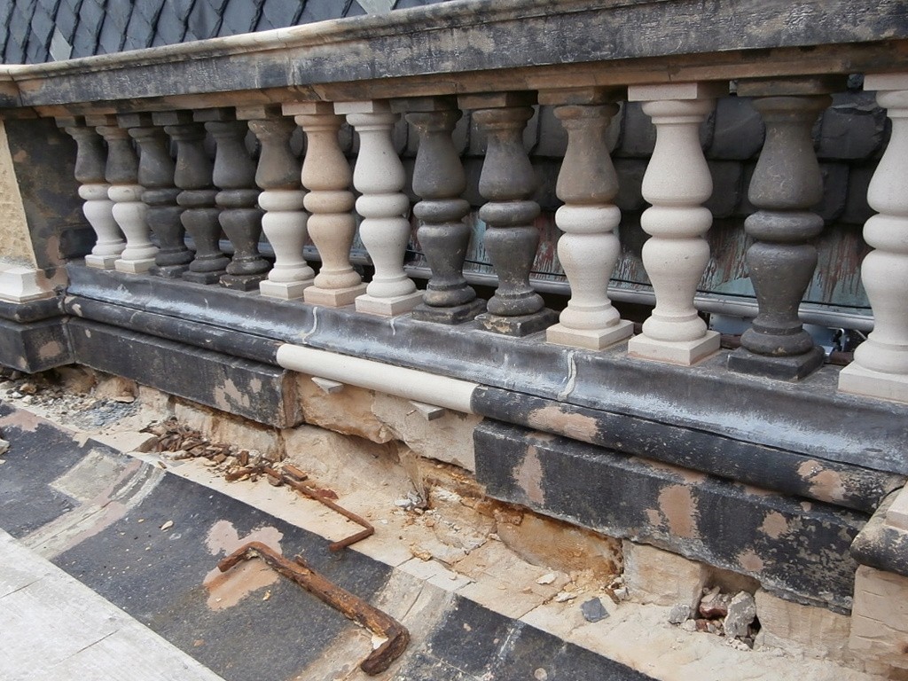 Spolu s korunní římsou byla také opravena celá balustráda. Původní kuželky balustrády byly vyrobeny z pískovce těženého u Hořic v Podkrkonoší. Na všechny nynější opravy se používal Božanovský pískovec. Je tvrdší, ale bělejší, proto se musel dopatinovat (foto 23, 24).