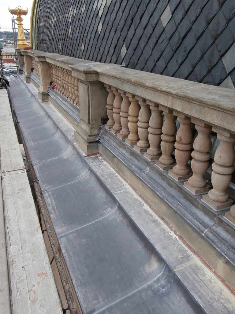 Celá sanovaná korunní římsa se zabalila do olověného oplechování (cca 3 mm), které se k podkladu lepilo. Tento postup byl zvolen pro spolehlivou ochranu římsy nepřístupné pro kontrolu a údržbu před pronikáním vody. Národní památkový ústav nadřadil požadavek na spolehlivou ochranu před vodou nad přísnou památkovou ochranu a povolil realizaci této nepůvodní technologie. Římsa sice není pohledová, ale i tak se provedla patinace její vrchní části. Současně se také provedlo nové oplechování zaatikového žlabu měděnou výstelkou, kde muselo dojít k napojení na ponechané olověné pásy pod kuželkami balustrád (foto 16, 17, 18, 19).