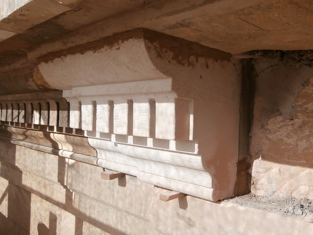 Statické zajištění se dotklo i zubořezu korunní římsy, který byl také v havarijním stavu. Před zahájením prací některé kusy hrozily zřícením. Proto bylo přistoupeno k sešití zubořezu, spodní část se sešívala nerezovými kotvami a celá horní část římsy sklolaminátovými tyčemi. Vzdálenosti a rozsah byly určeny podle rozsahu narušení a podle provedeného stavebně-historického a restaurátorského průzkumu (foto 20, 21, 22).