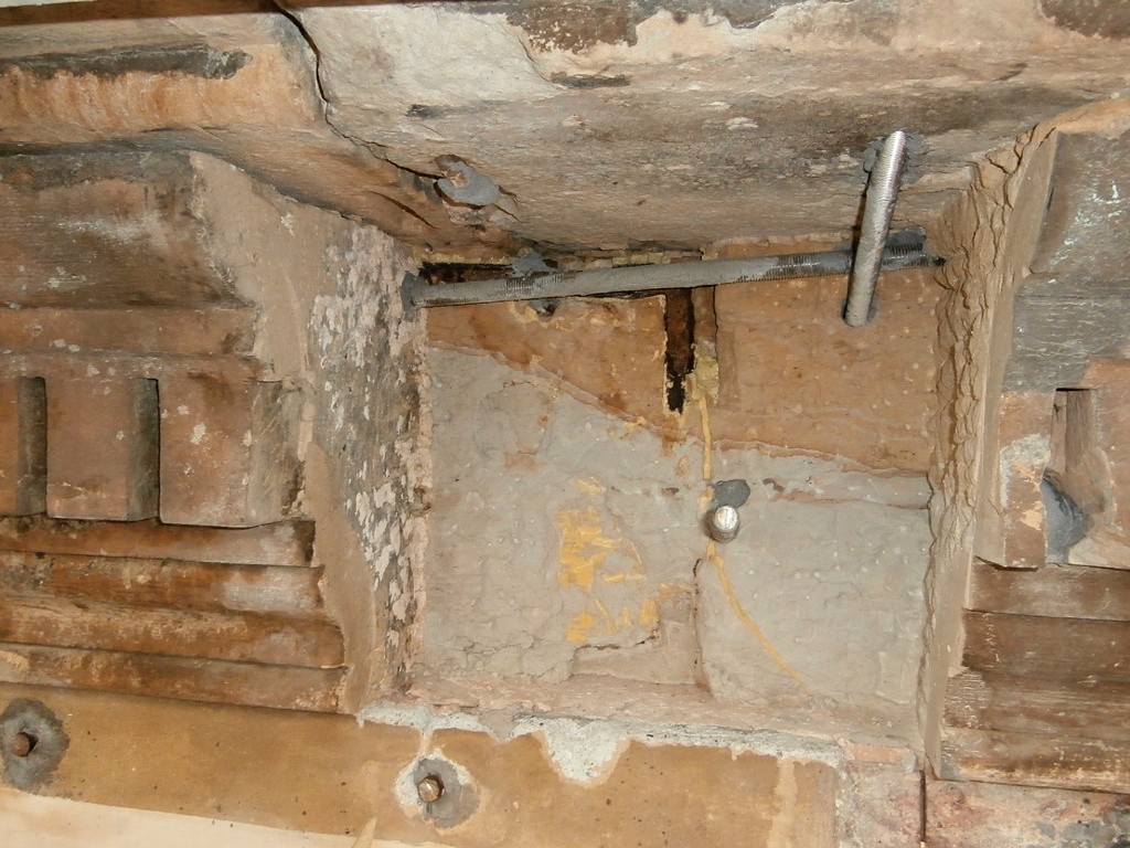 Velkým oříškem bylo demontování Ing. Fantyšem navrženého stažení jihovýchodního rohu z roku 1983, aby se mohlo přistoupit k nově navrženému zpevnění. Nikdo nevěděl, jak je stažení provedeno. Hledalo se detektory kovů z vnější i z vnitřní strany obvodové stěny. Objevily se domněnky, že bylo provedeno spřažení viditelné konstrukce s prvky vloženými do zdiva, nikde však nebyly patrné žádné spojovací prvky (foto 9, 10, 11).