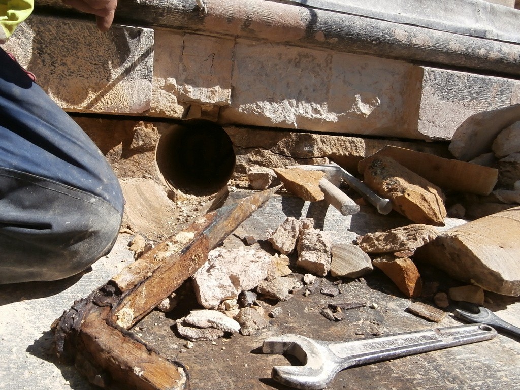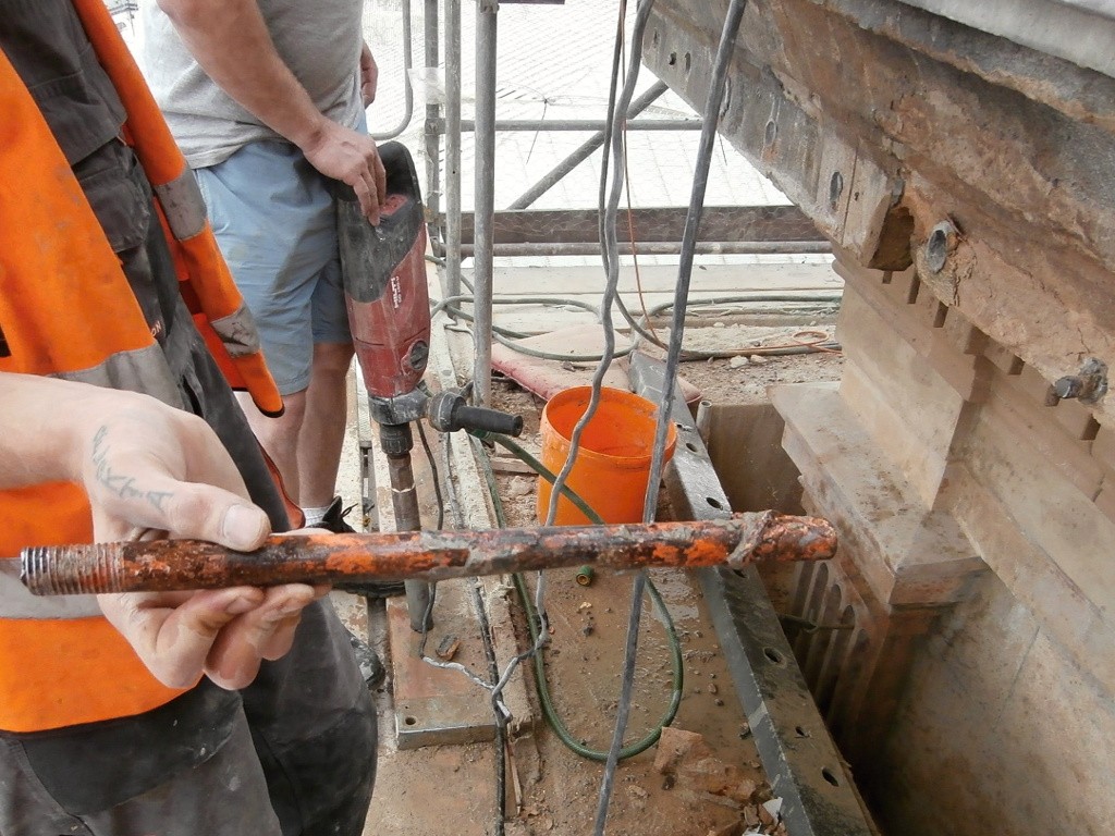 Detektor nikde nic nenašel. Začalo se uvažovat, že se ocelová konstrukce pouze odřízne do hloubky cca 100 mm, aplikuje se inhibitor koroze, vloží se kamenná plomba a bude hotovo. Poté jsme zkusili trochu zapáčit za vyčnívající závit, a co se nestalo - ocelová kulatina se závitem na konci se nechala bez většího odporu vytáhnout z otvoru. Byla pouze vložena do předem vyvrtané díry opatřené cementovou kaší. Byla to opravdu náhoda, takto vytáhnout šla pouze jedna tyč. Ale napomohlo to k rozhodování, jak odstranit Fantyšův roh. Ostatní tyče se odstranily jádrovými vrty (foto 12, 13).
