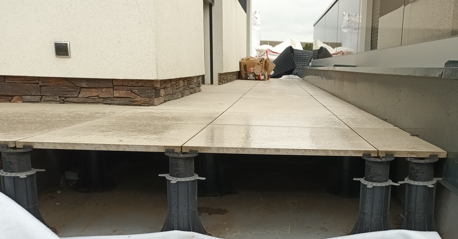 Na části plochy zůstala keramická dlažba na rektifikovatelných terčích, která sloužila dále pro pochůznost části střechy.