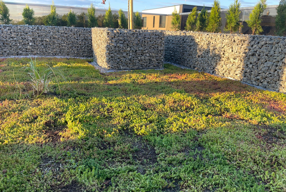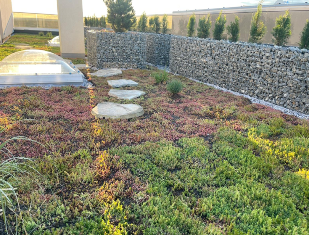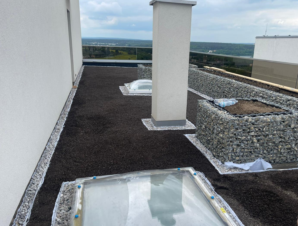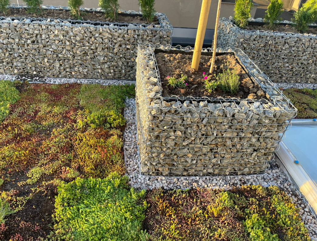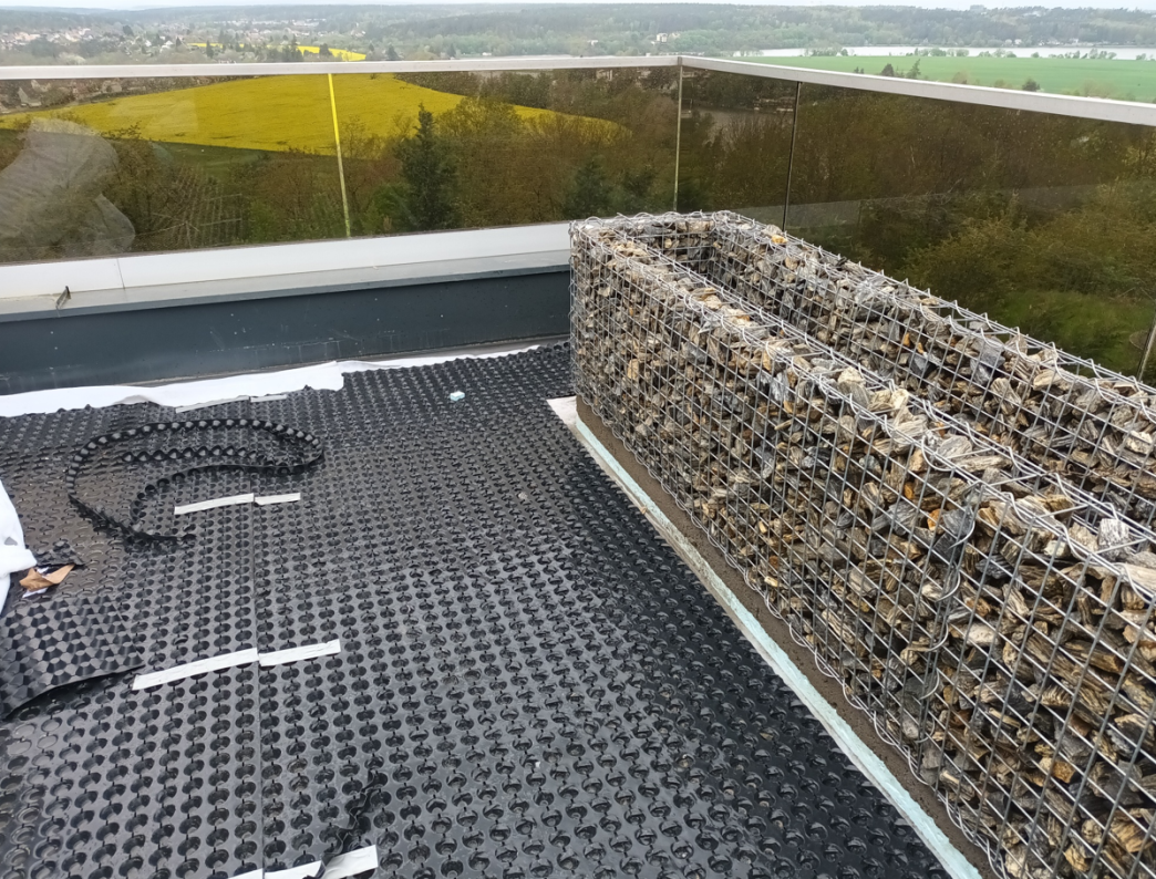 Jako první byly provedeny gabionové květníky, které slouží jako hlavní dekorační prvek nové střešní zahrady. Na separační a ochrannou textilii o plošné hmotnosti 500 gramů byly položeny desky z extrudovaného polystyrenu, dále přebetonovány základové patky, které zároveň slouží jako vyrovnání sklonu povrchu hydroizolace. Na betonových patkách byly svázány gabionové nerezové klece pro budoucí květníky. Do klecí se následně vkládalo dekorační kamenivo. Rozmístění květníků vůči odvodnění střechy nevyžadovalo podkládat květníky drenážní vrstvou.