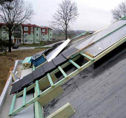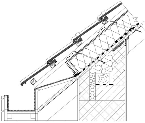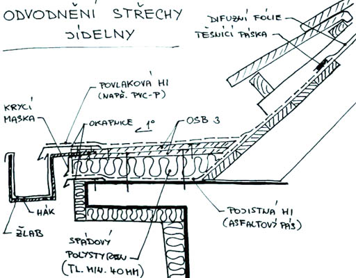 Tvar žlabu byl vytvořen tesařskou konstrukcí z dřevěných desek. Rozsah ploch opatřených hydroizolačním povlakem byl volen s ohledem na zajištění dostatečné bezpečnosti střechy před přelitím vody přes vnitřní okraj izolované plochy v případě zahlcení nebo ucpání odtoku (obr. 11). Bylo nezbytné vyřešit kontakt parotěsnicí vrstvy plnící zároveň funkci pojistné hydroizolační vrstvy s fóliovou hydroizolační vrstvou žlabu. Použila se plechová lišta. Dřevěný profil tvořící okraj tepelněizolační vrstvy je osazen tak, aby pod ním mohla vytékat případná voda proniklá na parotěsnicí vrstvu. Plechovou lištou se zároveň ukončila doplňková hydroizolační vrstva z difúzně propustné fólie. Pro připevnění, tvarování i ukončení hydroizolační fólie ALKORPLAN byly využity profily z plechu s vrstvou PVC-P.