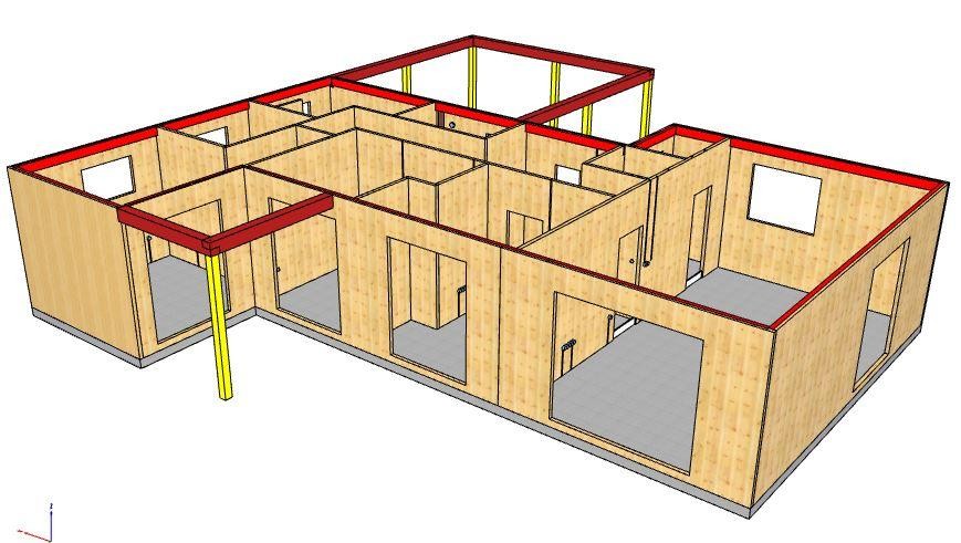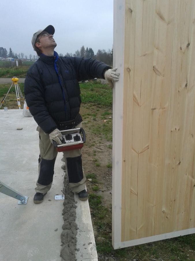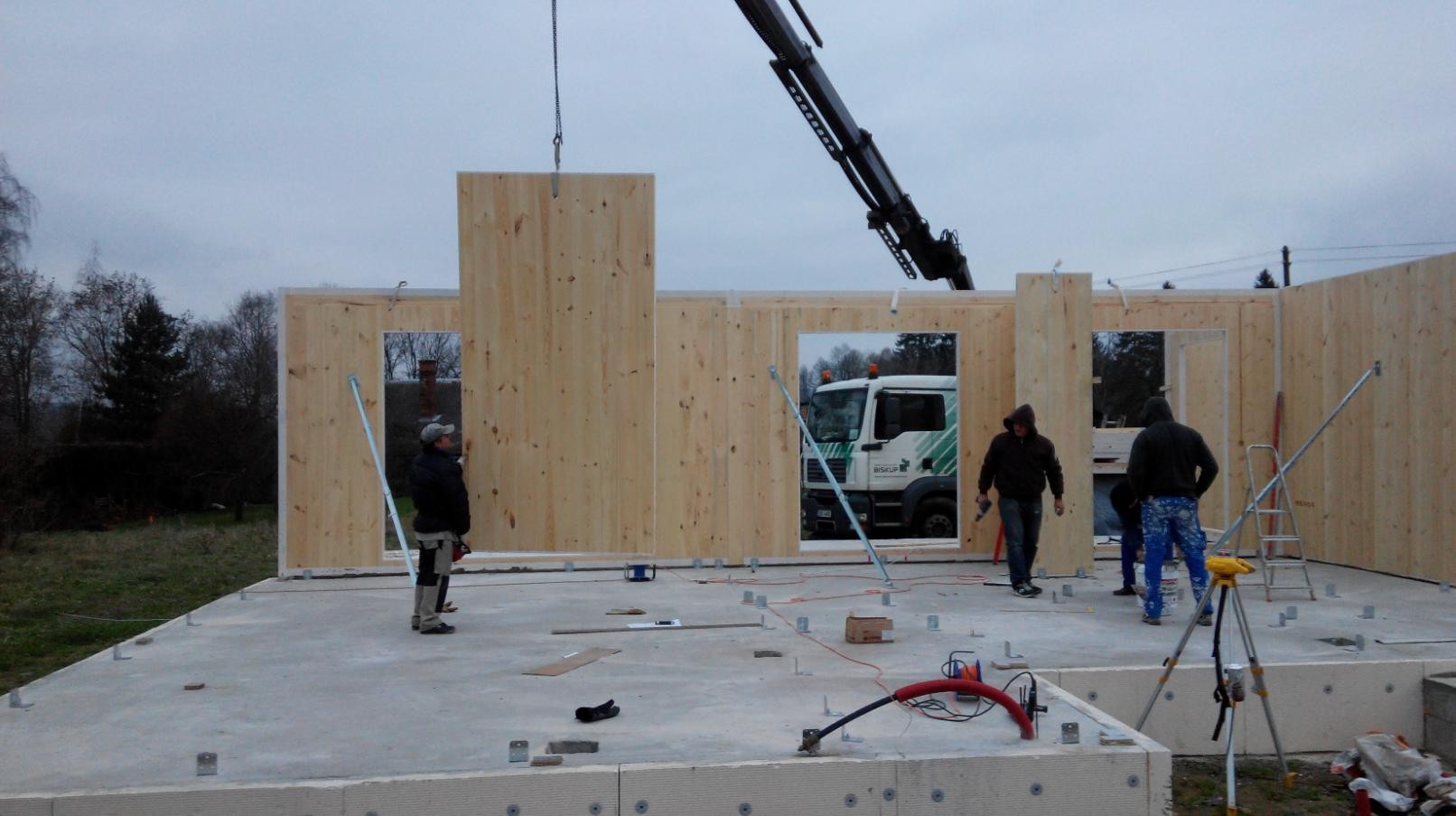 Následovala montáž hrubé stavby vybranou realizační firmou. Na připravené základy, opatřené shora hydroizolací a ochrannou betonovou mazaninou se nejprve vytyčila poloha budoucích stěn a osadily se ocelové úhelníky. Úhelníky se osazují vždy pouze z jedné strany panelu a ukotví se obvykle nejprve jednou průvlakovou kotvou do podkladu. Úhelníky se osazují minimálně 200 mm od konce panelů, popř. otvorů v panelech.