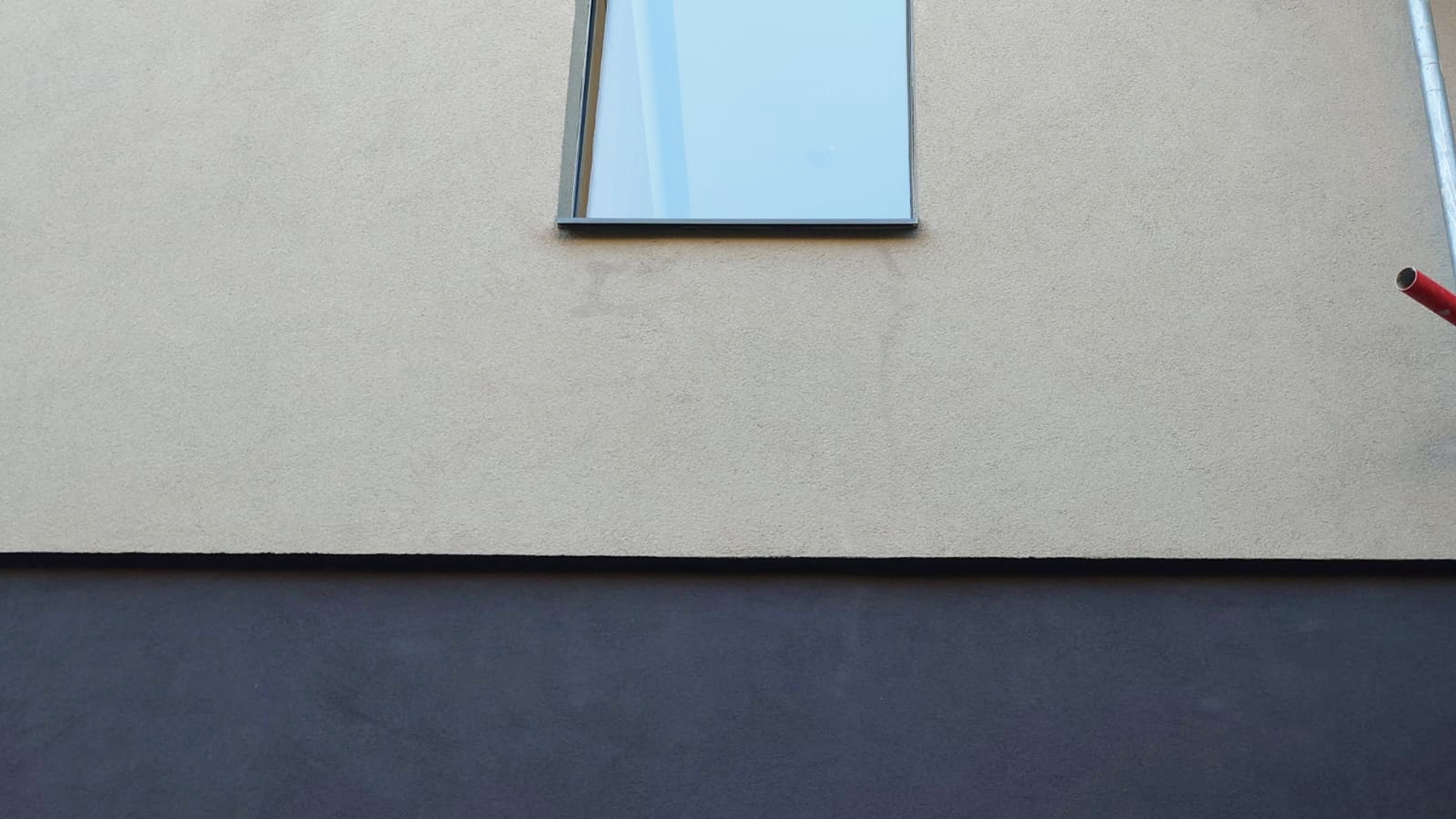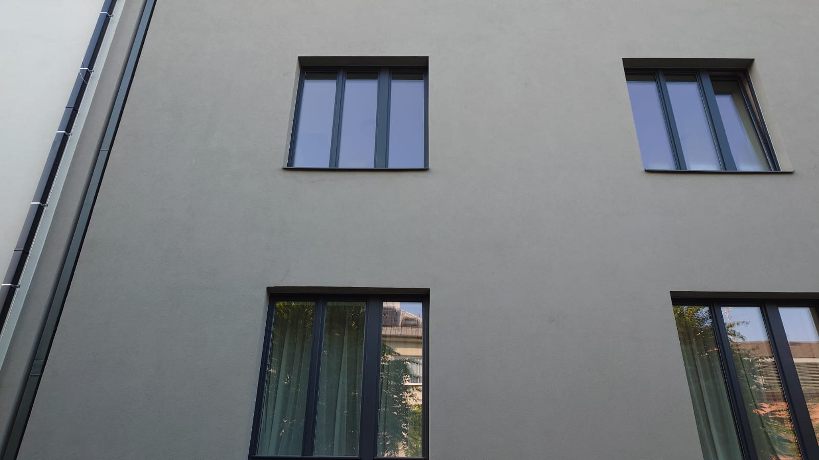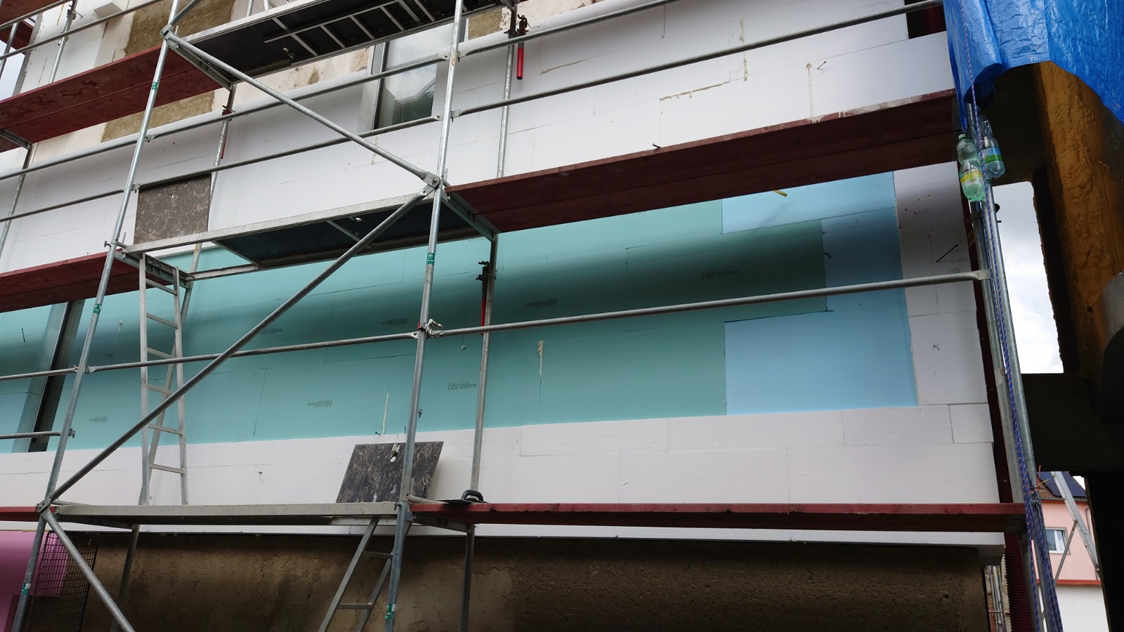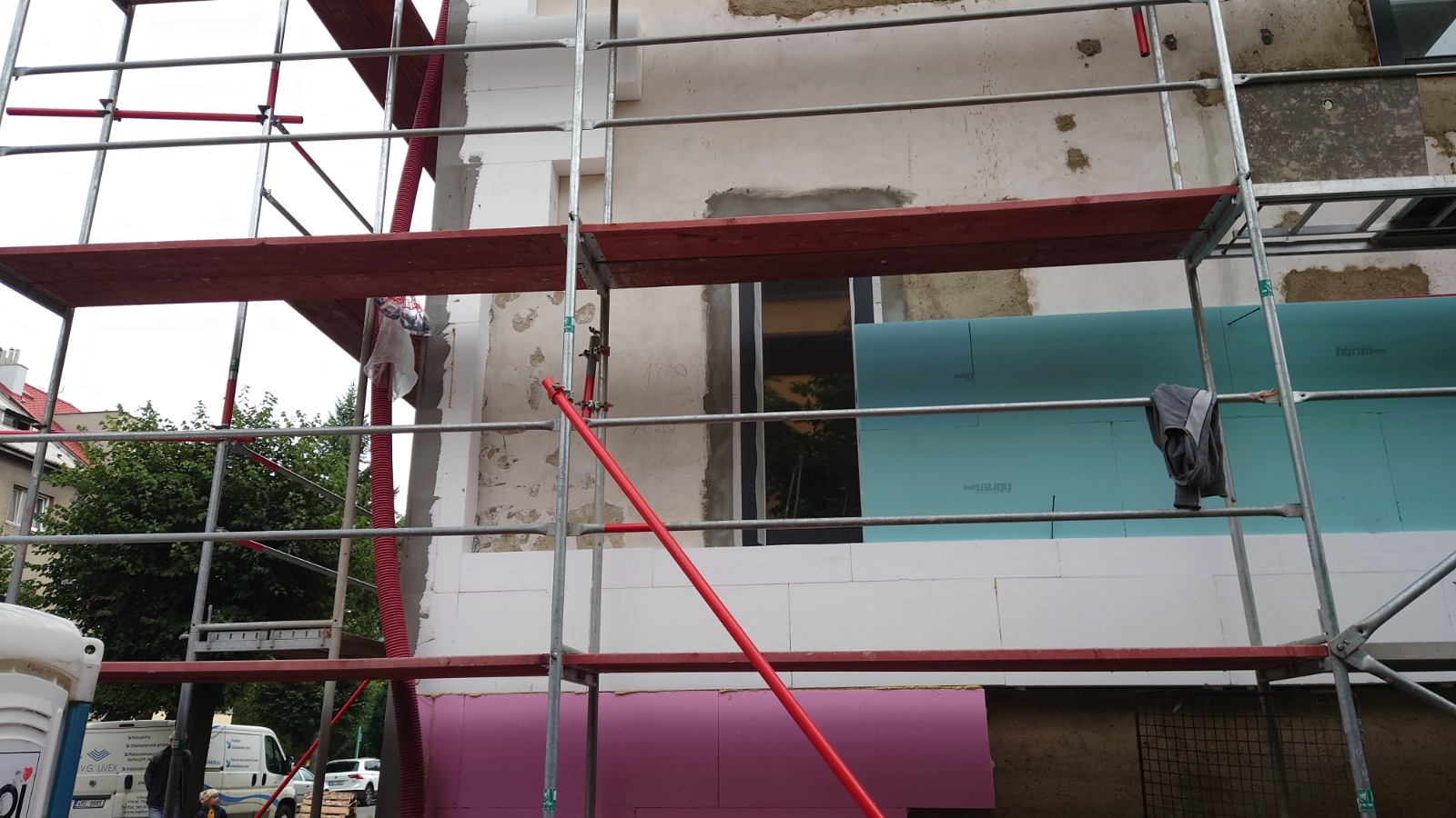 Na fotografiích z realizace zateplení je více vidět skutečné provedení zateplení. Okna byla osazena s vnějším povrchem omítky obvodové stěny. Byl zde architektonický požadavek na zapuštění povrchu fasády mezi okny. Kvůli menší tloušťce tepelné izolace bylo v tomto místě navrženo zateplení izolantem XPS tl. 130 mm místo bílého fasádního polystyrenu EPS 70F tl. 180 mm, který byl v celé další ploše fasády. Vzniklý odskok 50 mm byl opatřen plechovým parapetem, který byl na základní vrstvu s výztužnou tkaninou nalepen PU tmelem.