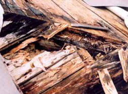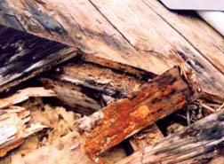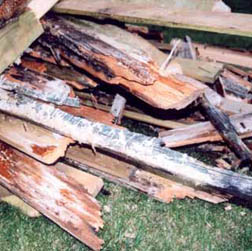 d) Také nosná dřevěná konstrukce krovu nalezena mokrá, poškozená dřevokaznou houbou, později identifikovanou jako koniofora sklepní (obr. 08).