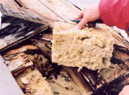 e) Naproti tomu vláknitá tepelná izolace se jevila suchá, bez stop destrukce (obr. 09).