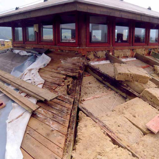Stav střechy si vynutil její rekonstrukci. Při rozkryvu se potvrdila plošná destrukce dřevěné konstrukce, a to zejména v horních partiích střechy a v oblasti nároží (obr. 14). Prkna byla nalezena rozložená v celém profilu (obr. 15), krokve v horní části (obr. 16).