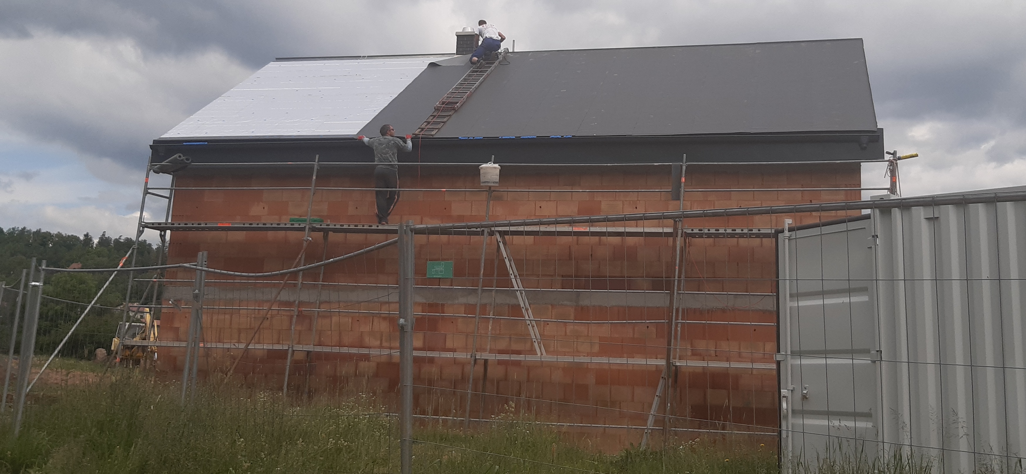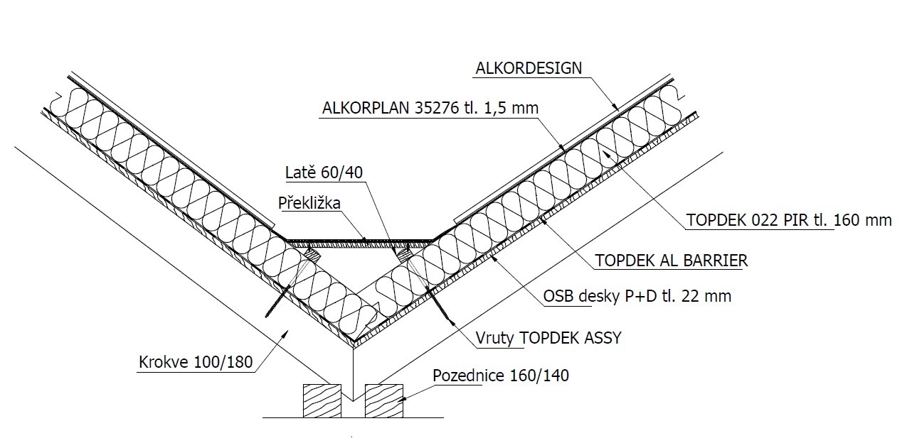 Po zvážení všech výše zmíněných úskalí a zároveň při zachování architektonické koncepce stavby jsme doporučili střechu řešit jako jednoplášťovou nevětranou s tepelnou izolací umístěnou nad krokvemi. Jako hlavní hydroizolace byla zvolena svařovaná hydroizolační PVC-P fólie ALKORPLAN 35276 v barvě antracit doplněná o profily ALKORDESIGN imitující stojatou drážku, která je typická pro vzhled plechové falcované krytiny. Toto řešení umožnilo střechu řešit bez nutnosti větrání, bez složitých konstrukčních detailů a s vysokou hydroizolační bezpečností. Zároveň byla zachována i estetická funkce, neboť na první pohled není poznat, že se nejedná o plechovou krytinu.