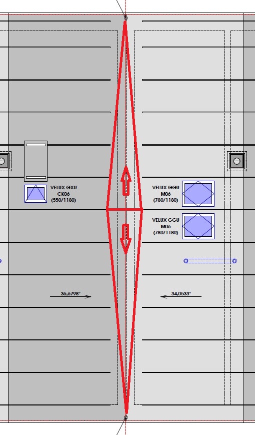 Střešní okna nad schodišťovým prostorem byla v prvním koncepčním návrhu umístěna v těsné blízkosti úžlabí (viz obr. 2). V této poloze byla ale jejich poloha s ohledem na namáhání deštěm a sněhem riziková. Střešní okna tak byla v dalším stupni projektové dokumentace posunuta výše k hřebeni střechy. Během provádění stavby byla nakonec tato okna zrušena úplně a nahrazena jedním světlovodem. K opracování zbyl pouze pod hřebenem střechy výlez z půdního prostoru ROTO WDA R35K WD 540/980 mm. Ten byl spolu se zateplovacím blokem osazen na pomocnou dřevěnou konstrukci.