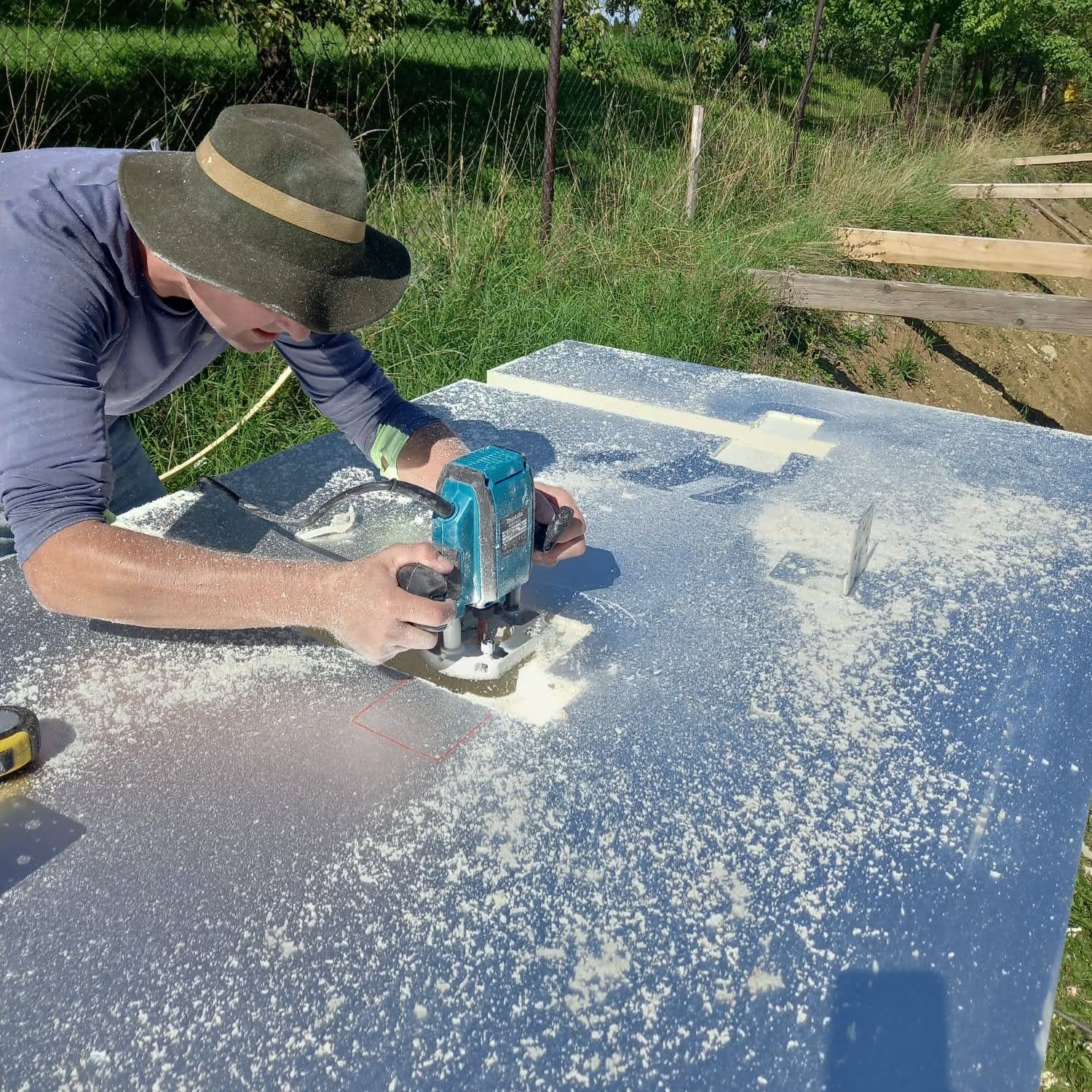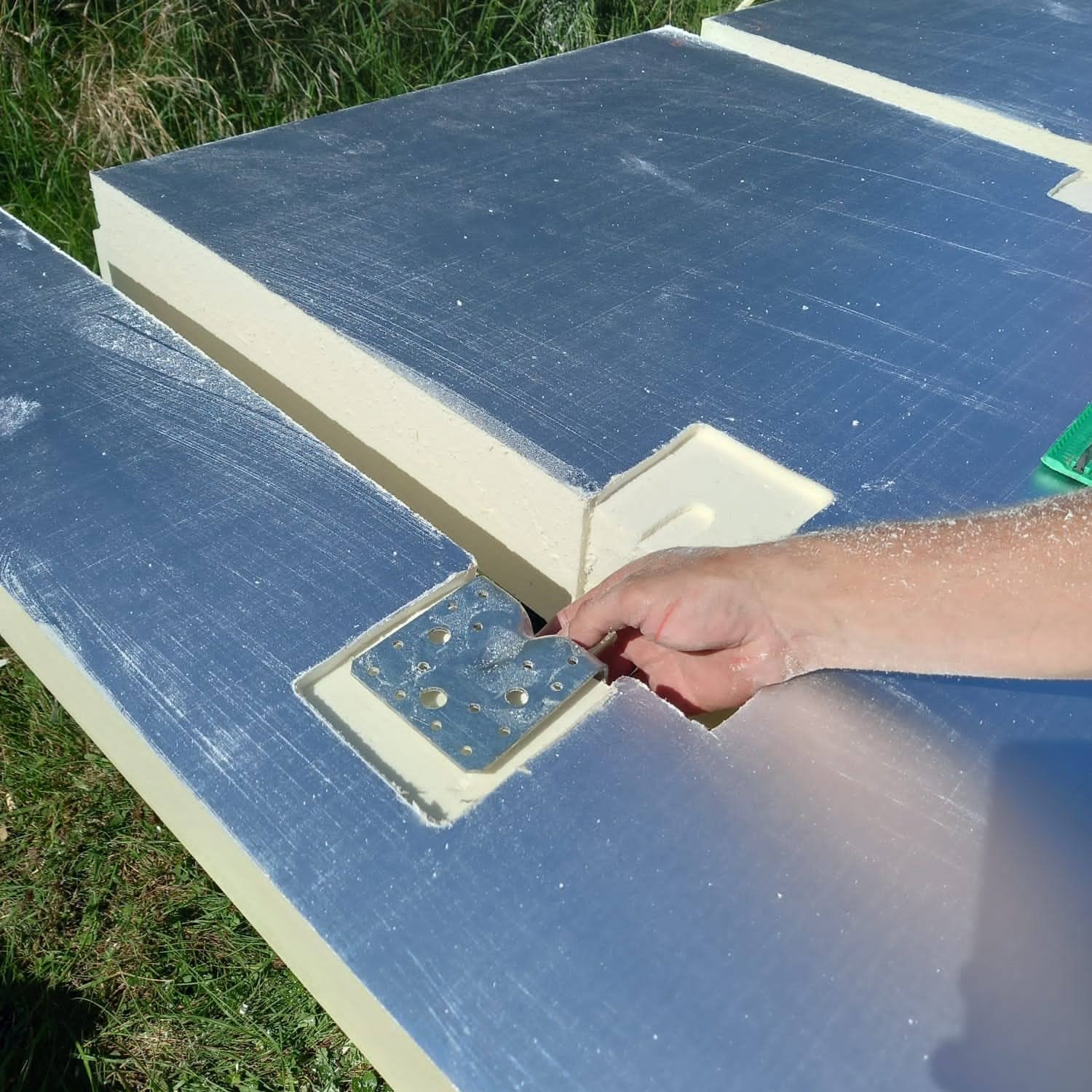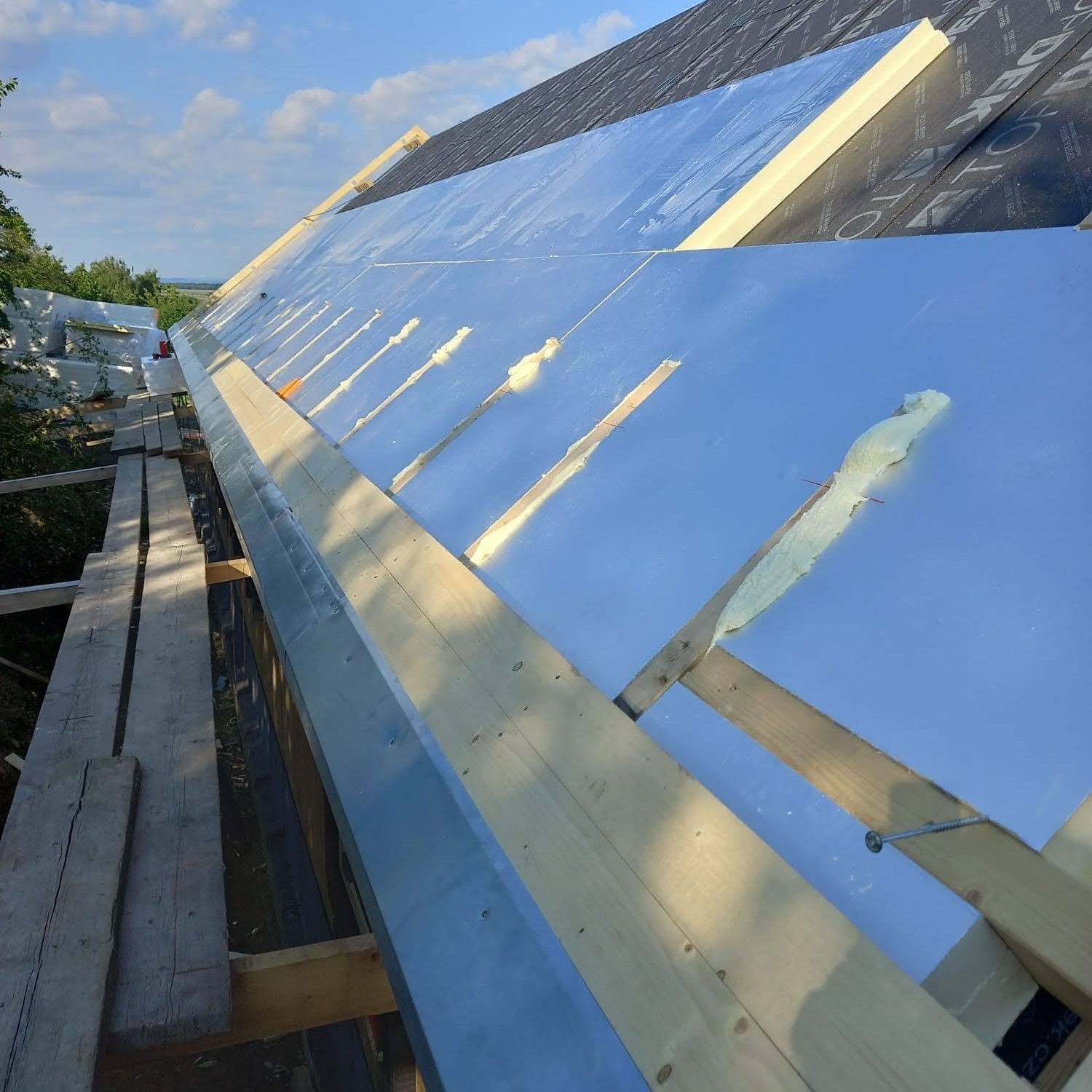 Při pokládání tepelné izolace si zhotovitel vysloveně vyhrál s frézováním polyisokyanurátových desek v místech, kde byly upevněny úhelníky tak, aby desky dokonale dosedly na povrch parozábrany. Takový postup sice není z hlediska funkčnosti skladby nutný, ale s ohledem na skvělý výsledek si zmínku zaslouží.