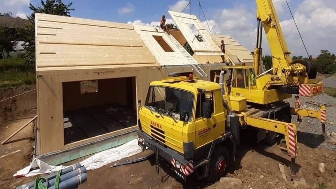 Investor a zhotovitel objektu v jedné osobě zvolil pro stavbu vlastního rodinného domu tvarově jednoduché a funkční uspořádání bez složitých konstrukčních detailů. K oběma štítům přiléhají prostory otevřené až do vrcholu střechy. V centrální části jsou přízemní prostory a nad nimi podkrovní místnost, také otevřená až do vrcholu střechy. Investor chtěl docílit toho, aby vnitřní povrchy všech místností tvořily dřevěné biodesky. Proto byly stěny, strop v centrální části domu i nosná konstrukce střechy navrženy z dřevěných panelů. Pro jejich montáž byla na stavbě nezbytná těžká mechanizace. Při stejné zastavěné ploše poskytlo použití dřevěných panelů pro stěny větší užitnou plochu místností než ostatní konstrukční systémy.