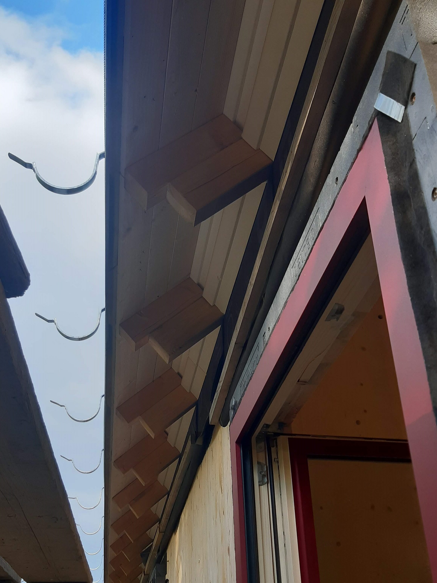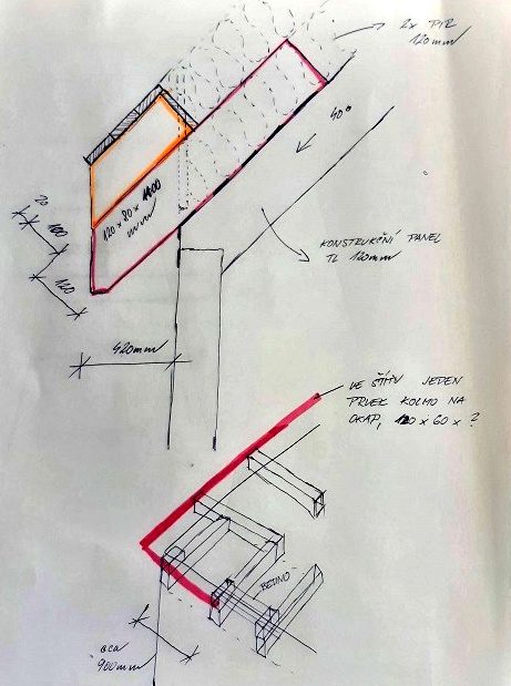 Zajímavým bodem realizace jsou smykové podpory (námětky), které se podílejí na stabilizaci střešní skladby proti sesunutí a zároveň vynášejí okraj střechy do vzdálenosti 420 mm od vnějšího povrchu panelů obvodové stěny. Tato vzdálenost odpovídá celkové tloušťce navržené skladby větrané fasády. Po dokončení fasády přesah střechy zmizí, jediným prvkem přesahujícím přes styk střechy s fasádou po dokončení stavby zůstane přiznaný podokapní žlab. Návrh i realizace námětků byly snazší díky tomu, že nosný panel, do kterého se celá skladba fixuje, je v celé ploše materiálově homogenní. Nebylo nutné brát ohled na přesnou polohu dřevěných krokví nebo ztužujících žeber, jako je tomu při fixaci smykových podpor u systémových skladeb TOPDEK na krovech nebo na keramických či pórobetonových šikmých konstrukcích zmíněných v úvodu článku.