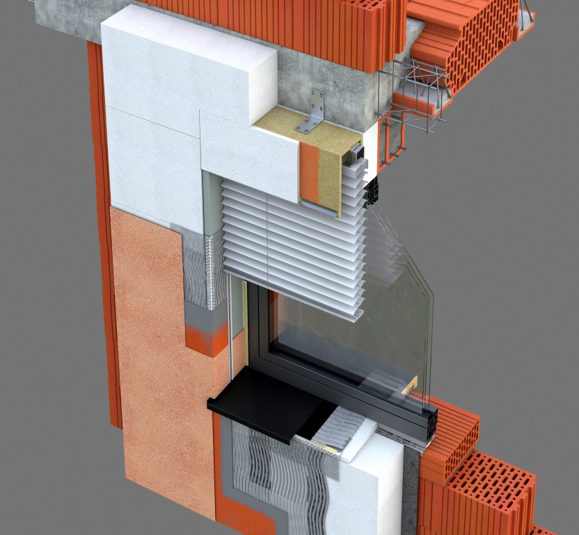 Další skladbou je umístění venkovní žaluzie do skryté schránky ISO-KASTL. Kvůli náročnosti stavební přípravy je nutné pracovat s tímto typem montáže počítat už během projektování. Obvodové zdivo je tvořeno Zdivem Porotherm 25 EKO+ Profi. Tepelnou izolaci konstrukce tvoří EPS tl. 200 mm. ISO-KASL je zabudován v úrovni překladu. ISO-KASTL je zapuštěný do vrstvy tepelné izolace. Proti vzniku nežádoucích trhlin je na přední straně krytu EPS tloušťky 20 mm. V napojení ISO-KASTLU a ETICS doporučujeme klást důraz na vyztužení detailu a použití diagonálně umístěných pruhů výztužné tkaniny. Mezi krytem a překlady je použita izolace XPS tl. 60 mm.
