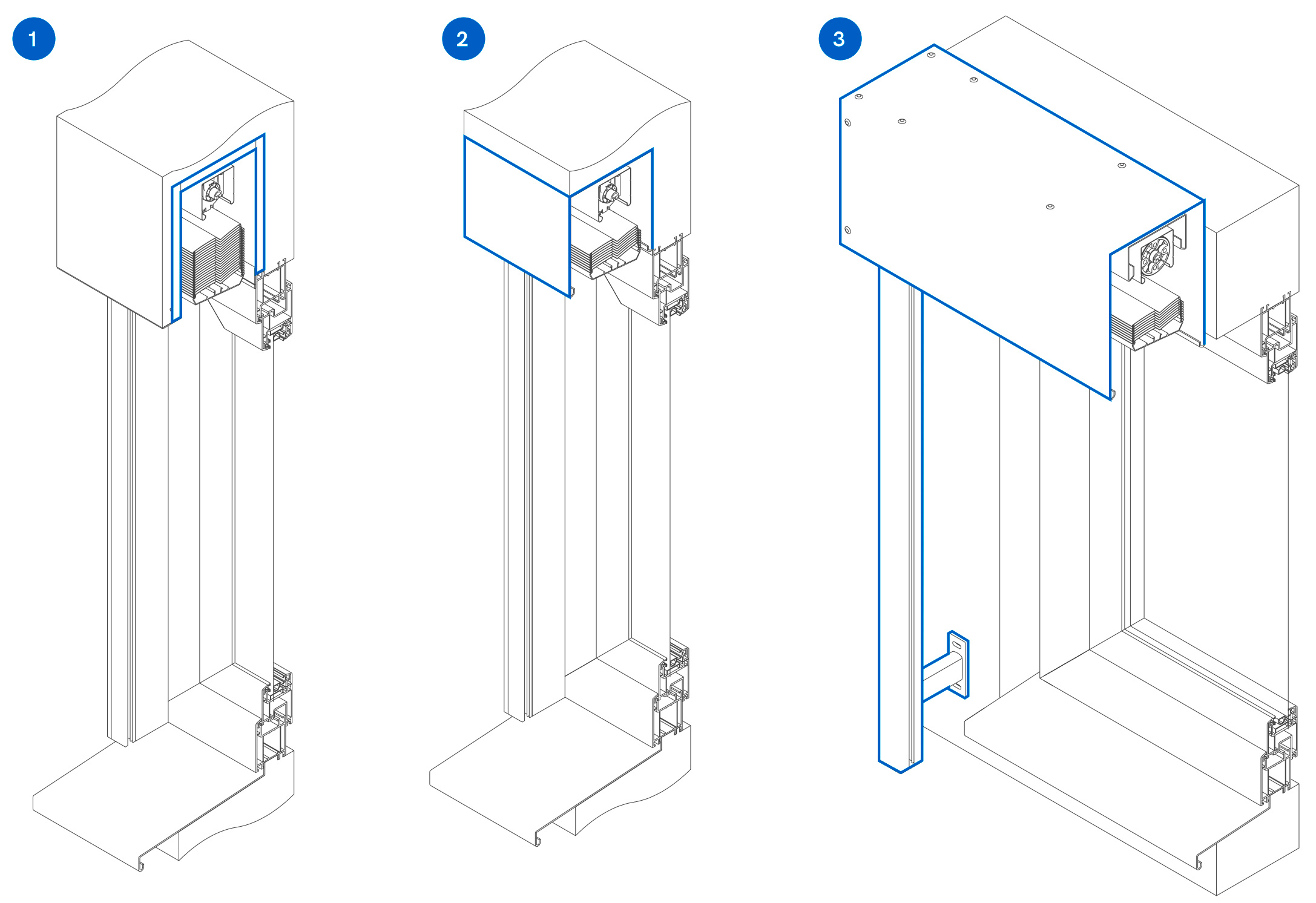 Pohledový krycí plech se připevňuje do okenního otvoru a připevňuje se držáky do nadpraží. Krycí plech musí být hluboký minimálně 130 mm, aby do něj šly nainstalovat vnější žaluzie. Může se stát, že otvor nebude dost hluboký a plech bude mírně vystupovat před fasádu. V tomto případě doporučujeme provést utěsnění spáry tak, aby mezi plech a nadpraží nevnikala voda.