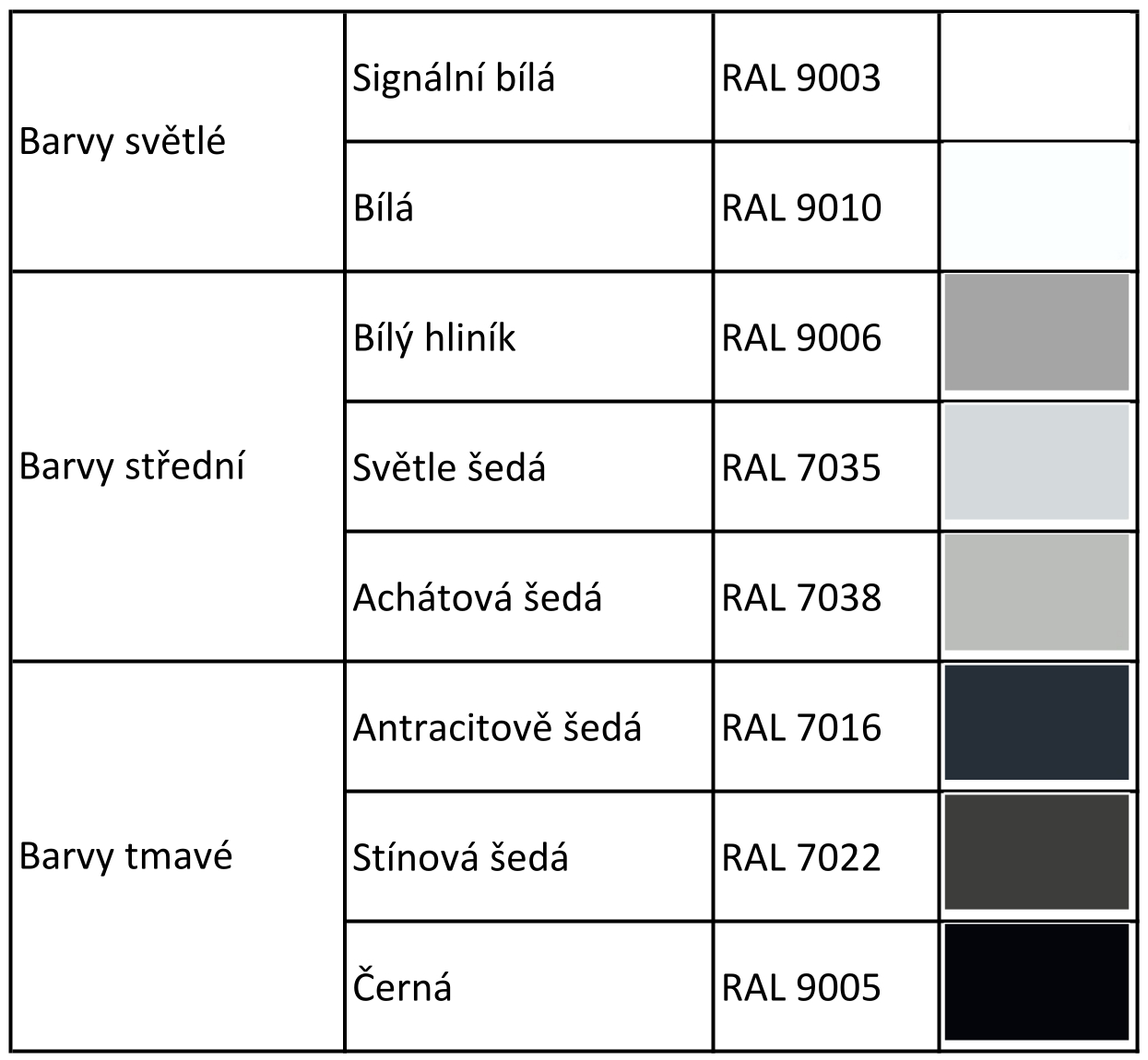 Venkovní žaluzie NEVA typu Z, S a C lze dodat v celkem 22 barvách dle vzorníku. Z toho 21 barev je strukturovaných a 1 barva hladká. Za příplatek dodávají Stavebniny DEK také žaluzie v téměř jakékoliv barvě a to jak v hladkém, tak strukturovaném provedení. V požadované barvě dodají Stavebniny DEK také komponenty žaluzií, jako vodicí a spodní profily nebo krycí plechy. Barvy příslušenství a lamel lze sladit například s barvou rámu oken. Může být stejná nebo jiná, pokud je cílem dosáhnout kontrastu.